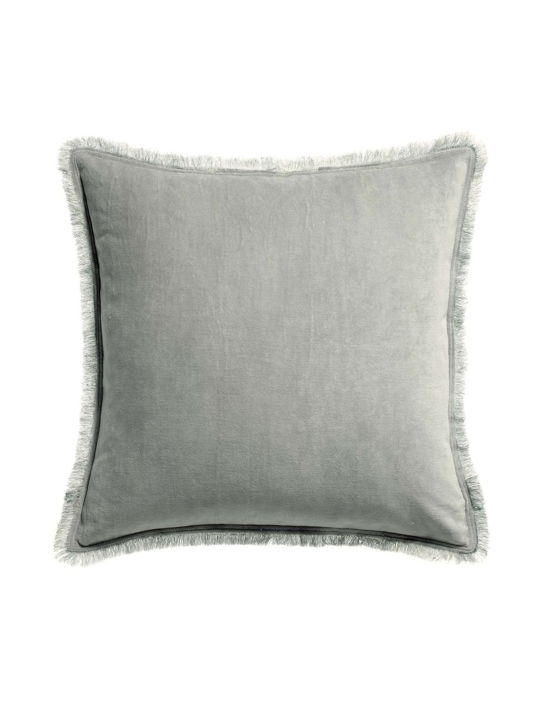 Sametový povlak na polštář v světle šedé barvě. Okraje povlaku mají ozdobný roztřepený okraj.