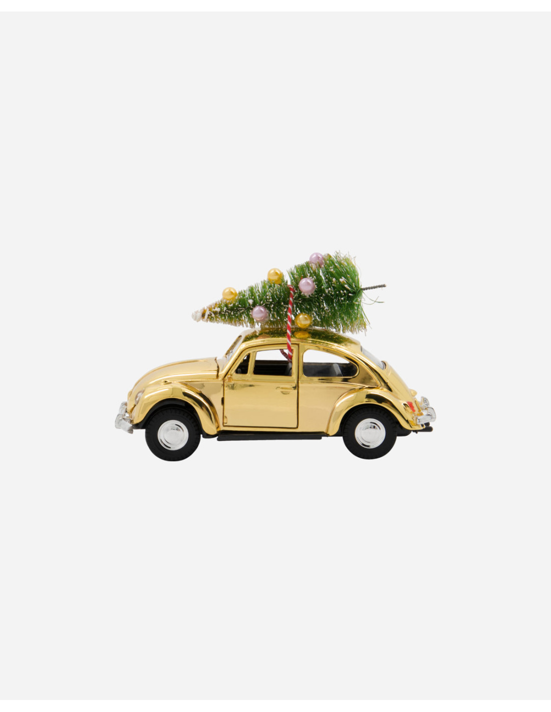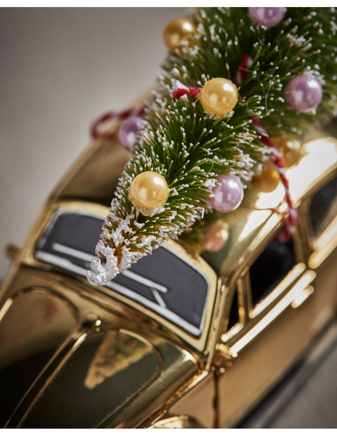Vánoční dekorace ve tvaru zlatého autíčka se stromečkem na střeše vnese do vašeho domova nostalgii a radost z tradičních svátečních chvil. Detaily jako mini vánoční stromek ozdobený drobnými baňkami dodávají dekoraci hravý a kouzelný charakter.