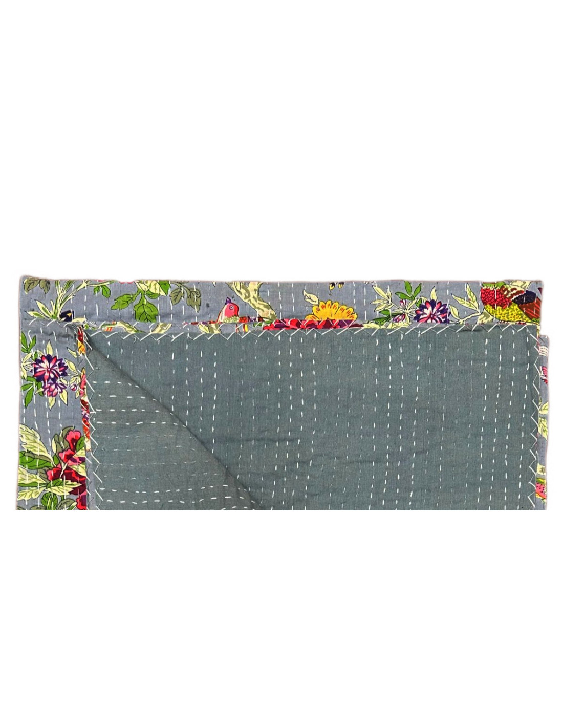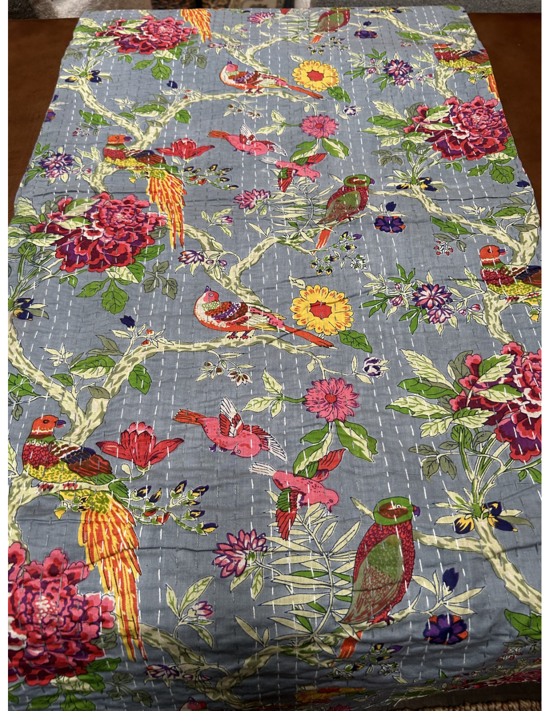 Bavlněný přehoz s barevným potiskem květů a ptáků na šedém podkladu a s barevným ručním prošíváním.