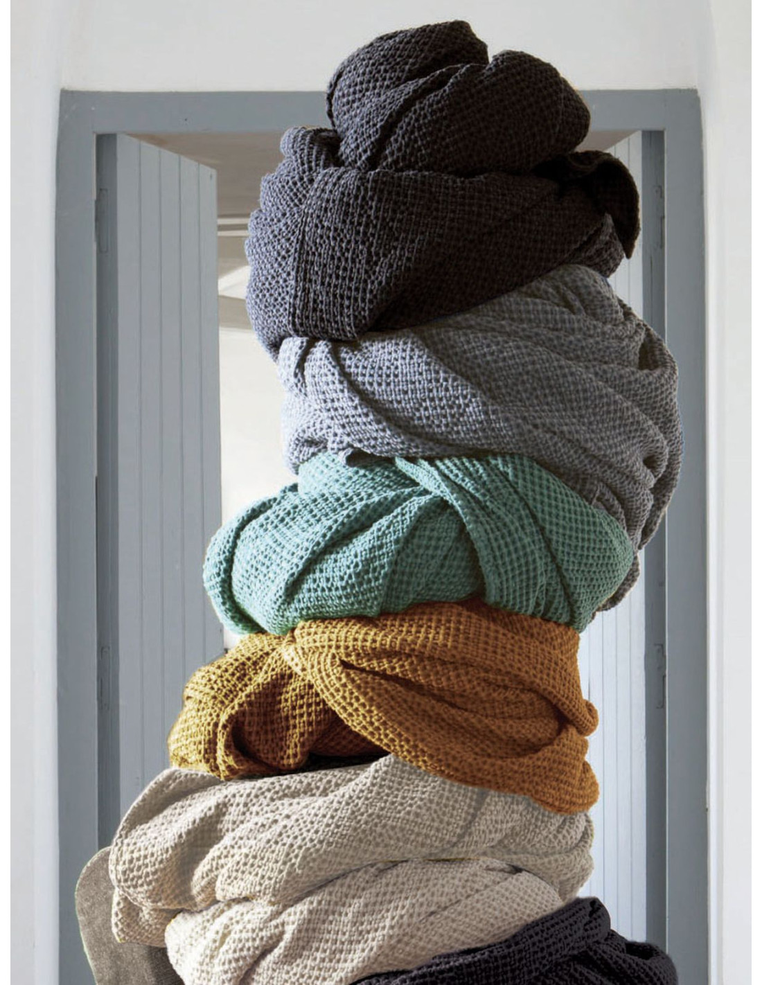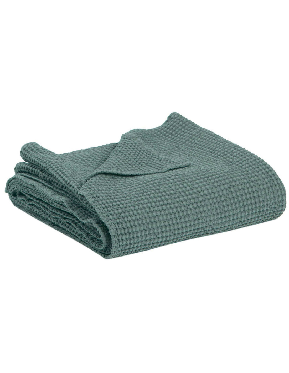 Přehoz Maia z recyklovaného materiálu, s vaflovou strukturou a modro-šedo-zelenou barvou. Díky materiálu, zpracování, nabídce barevných odstínů ve francouzském duchu, ale i pro svoji snadnou údržbu jsou tyto přehozy oblíbené u našich zákazníků.