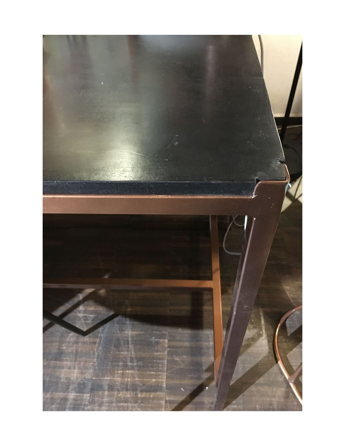 První fotka je ilustrativní, barva stolu je: černá dřevěná deska a kovová konstrukce v měděné barvě.