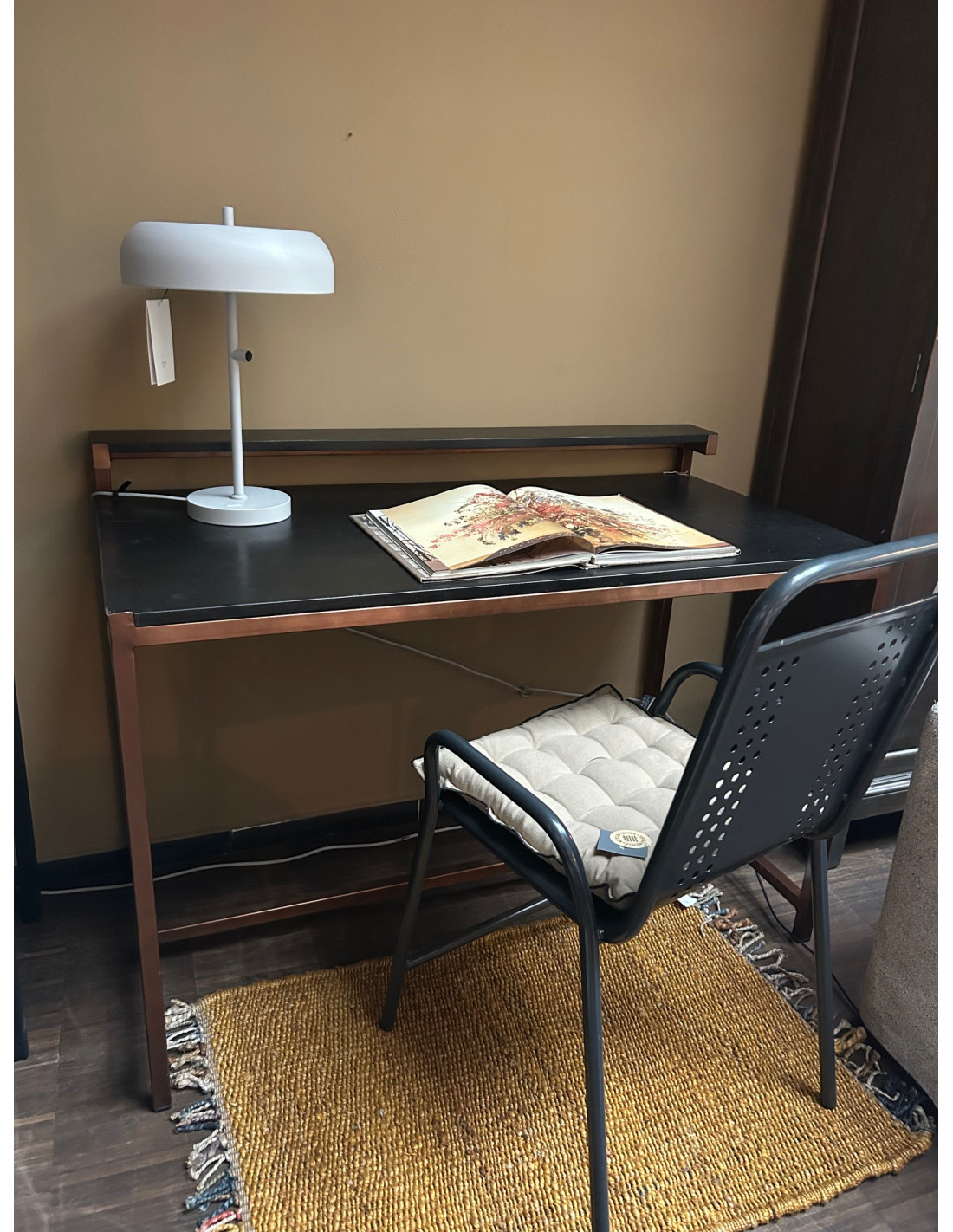 Pracovní stůl má jednoduchou kovovou konstrukci v měděné barvě, pracovní plocha a polička jsou z masivního dřeva exotického manga. Dřevo je v černé barvě. Aby vám dřevo zůstalo krásné po dlouhou dobu, používejte podtácky a dřevo pravidelně ošetřujte přípravky na dřevo.