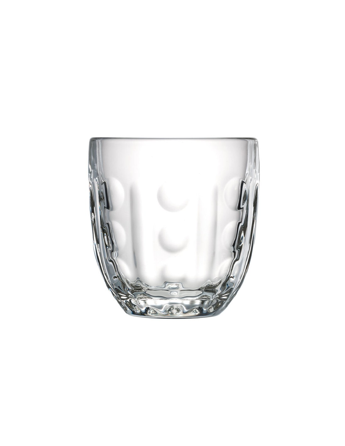 Samostatná sklenička z originální kolekce Troquet s jednoduchým dekorem v podobě vybroušených podélných a kulatých plošek. Sklenka je vhodná na vodu nebo teplé nápoje. Je ve stejném designu jako šálky na espesso Troquet.