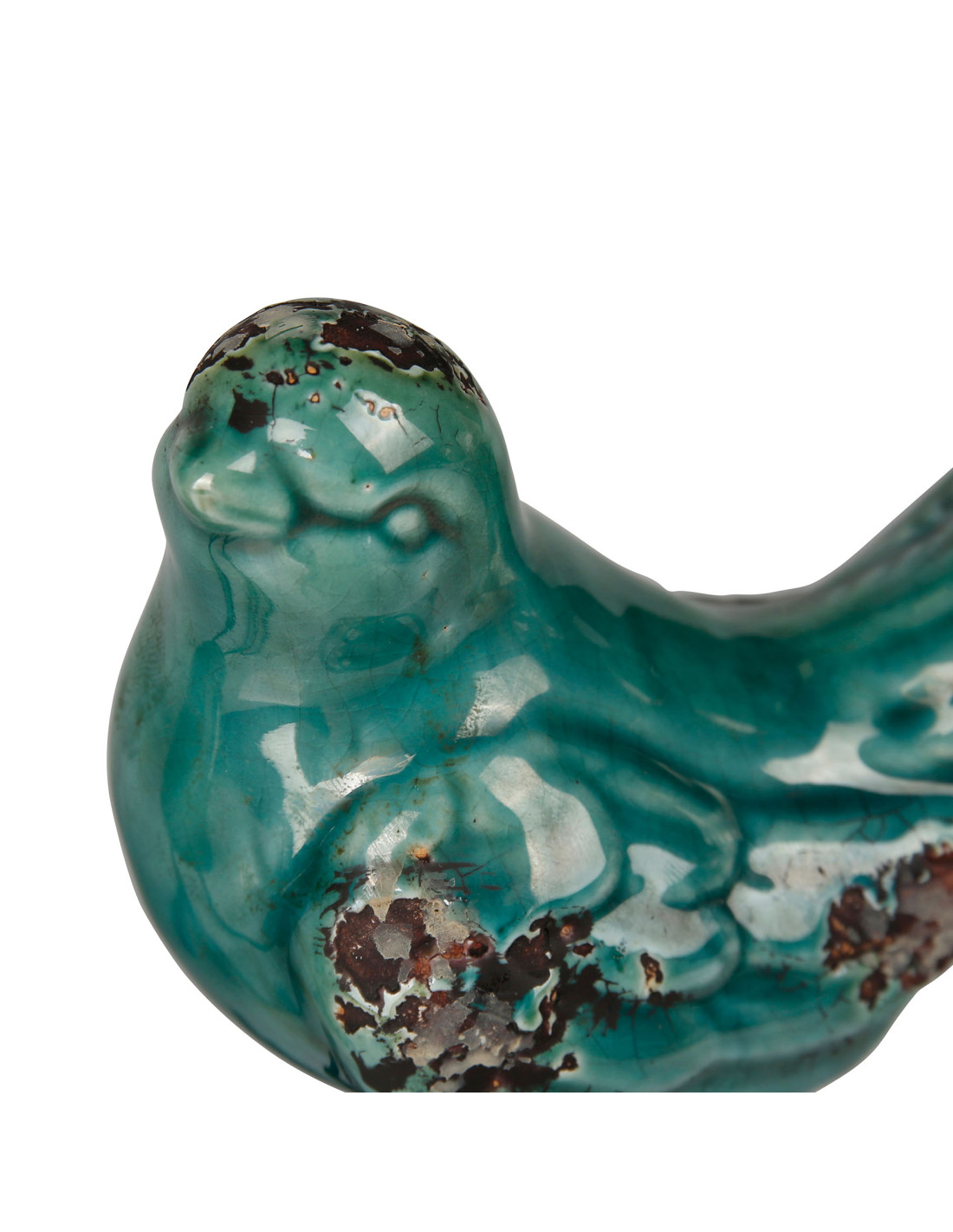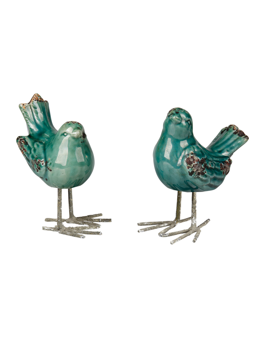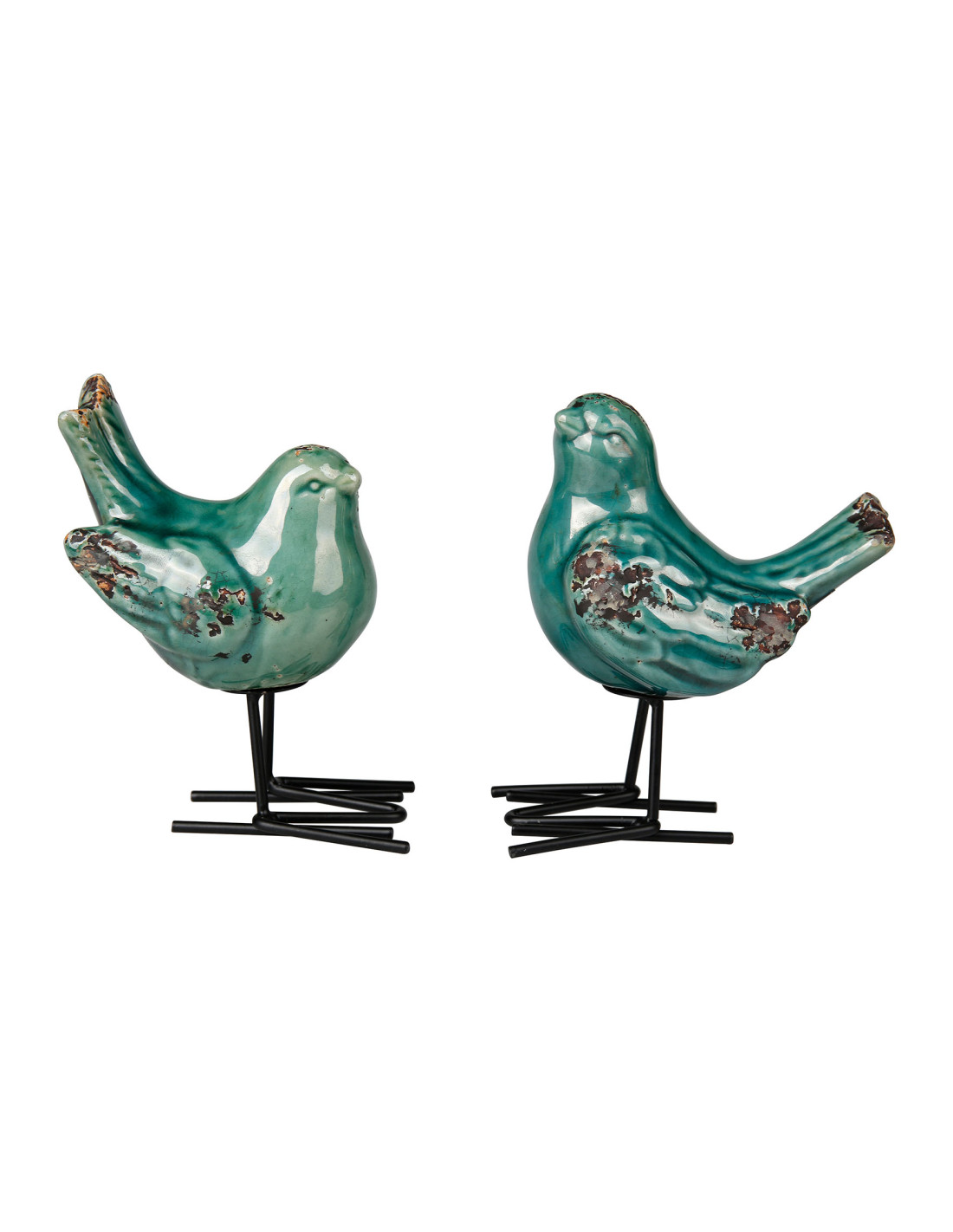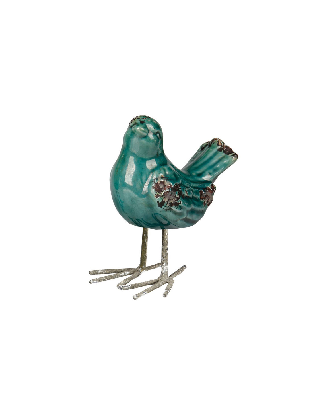 Ptáček je vyroben z glazované keramiky s výraznou patinou, nožky jsou kovové.