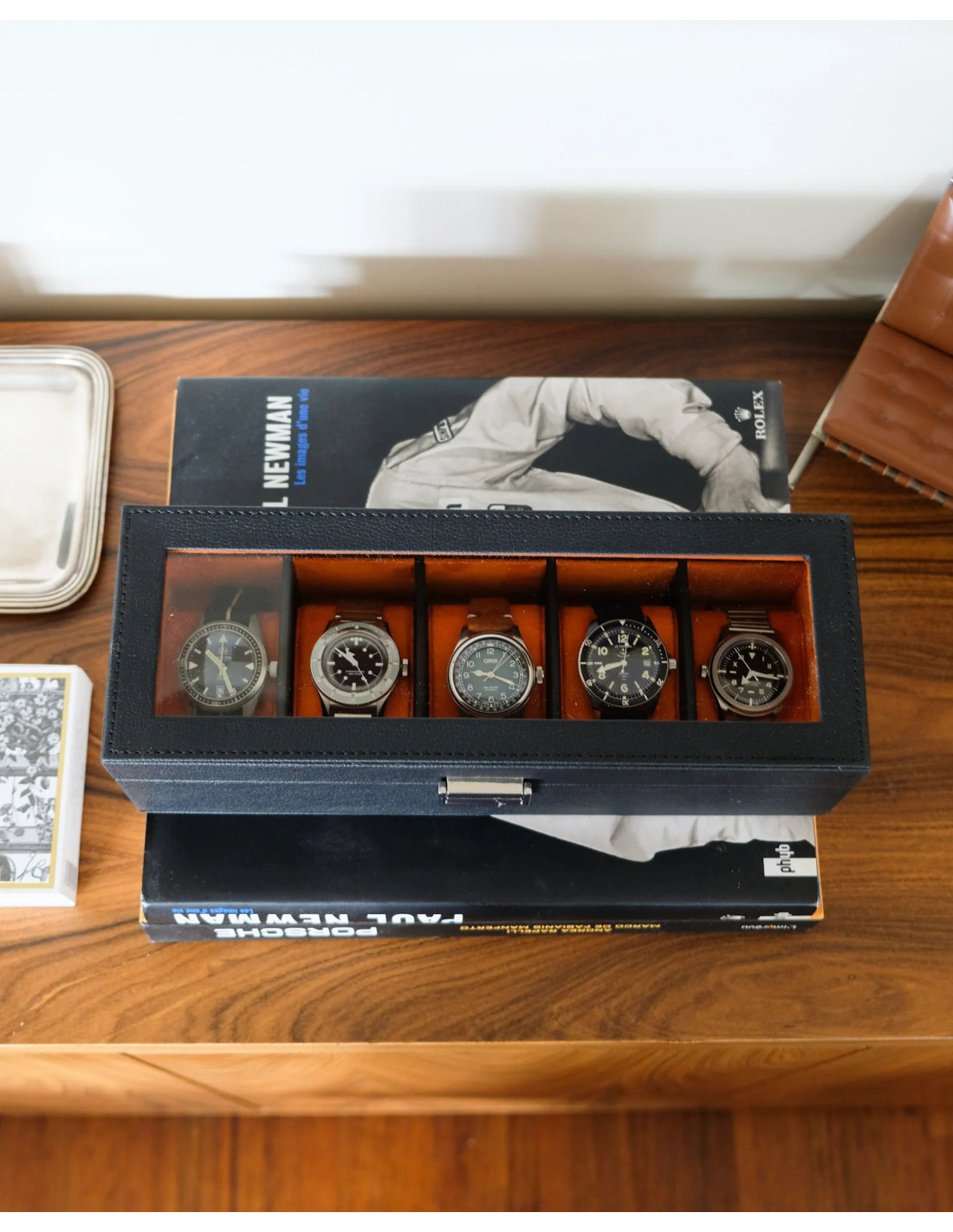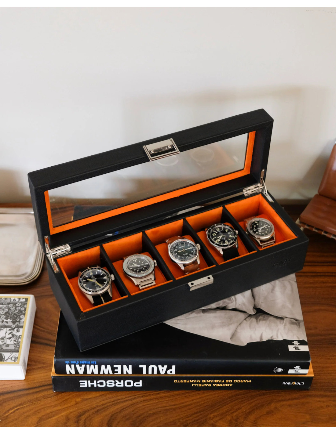 Luxusní pouzdro na 5 hodinek, černé / oranžové | MAISON SCARLET