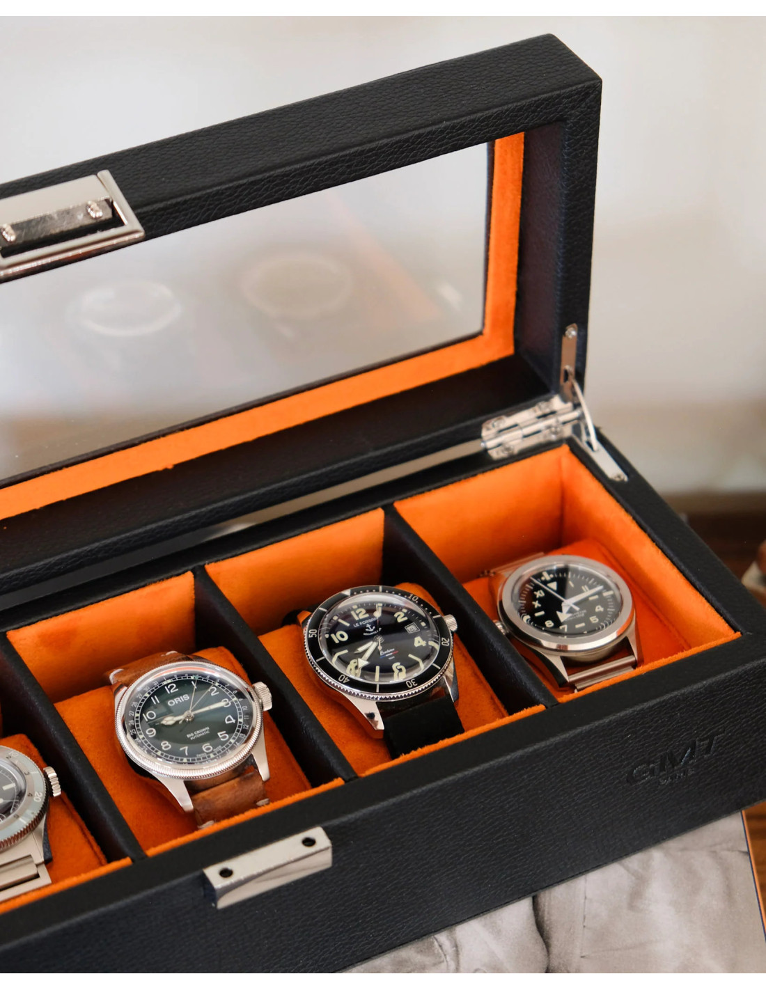 Stylový box na vaši sbírku hodinek v elegantní černé, doplněnou kontrastním interiérem z oranžového sametu.