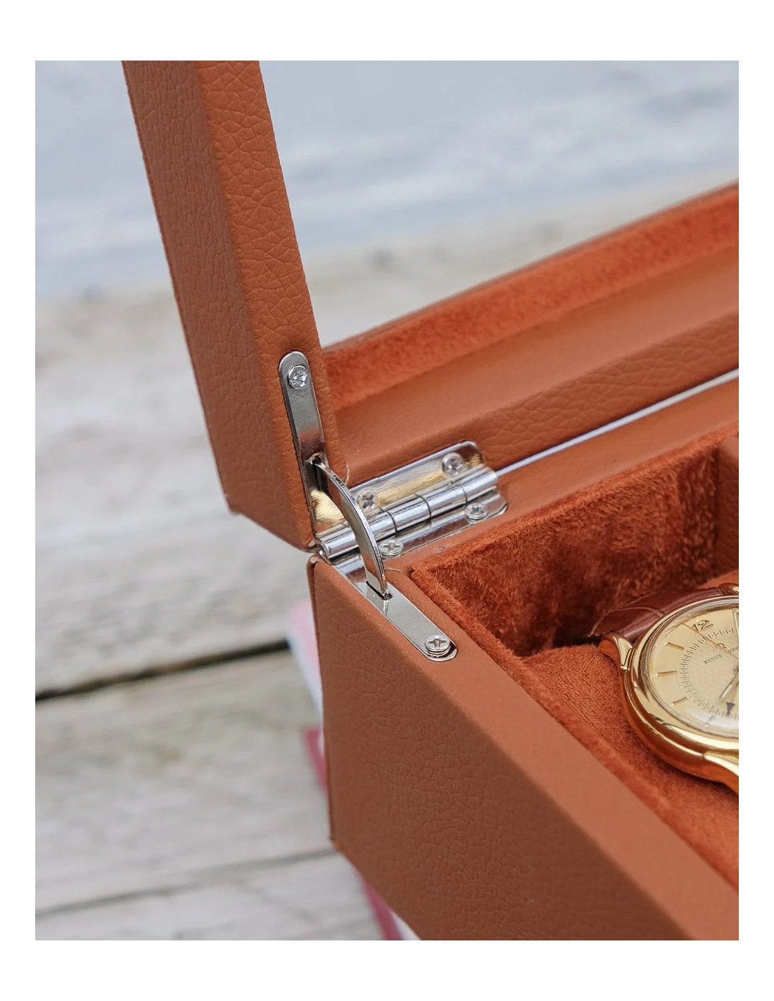 Detailně zpracovaný elegantní box na hodinky z kvalitní umělé kůže a měkkého sametu, s kovovým zapínáním a s vyjímatelnými polštářky pro snadné ukládání i vyndavání hodinek.