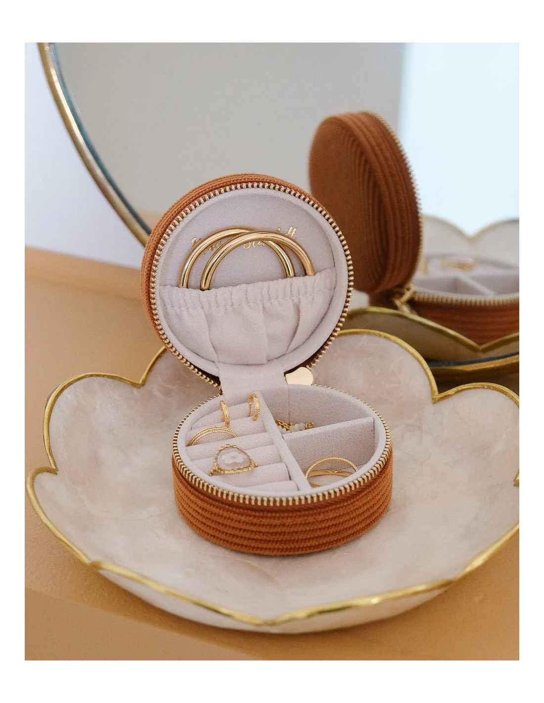 Kulatá cestovní šperkovnice z manšestru v barvě camel | MAISON SCARLET