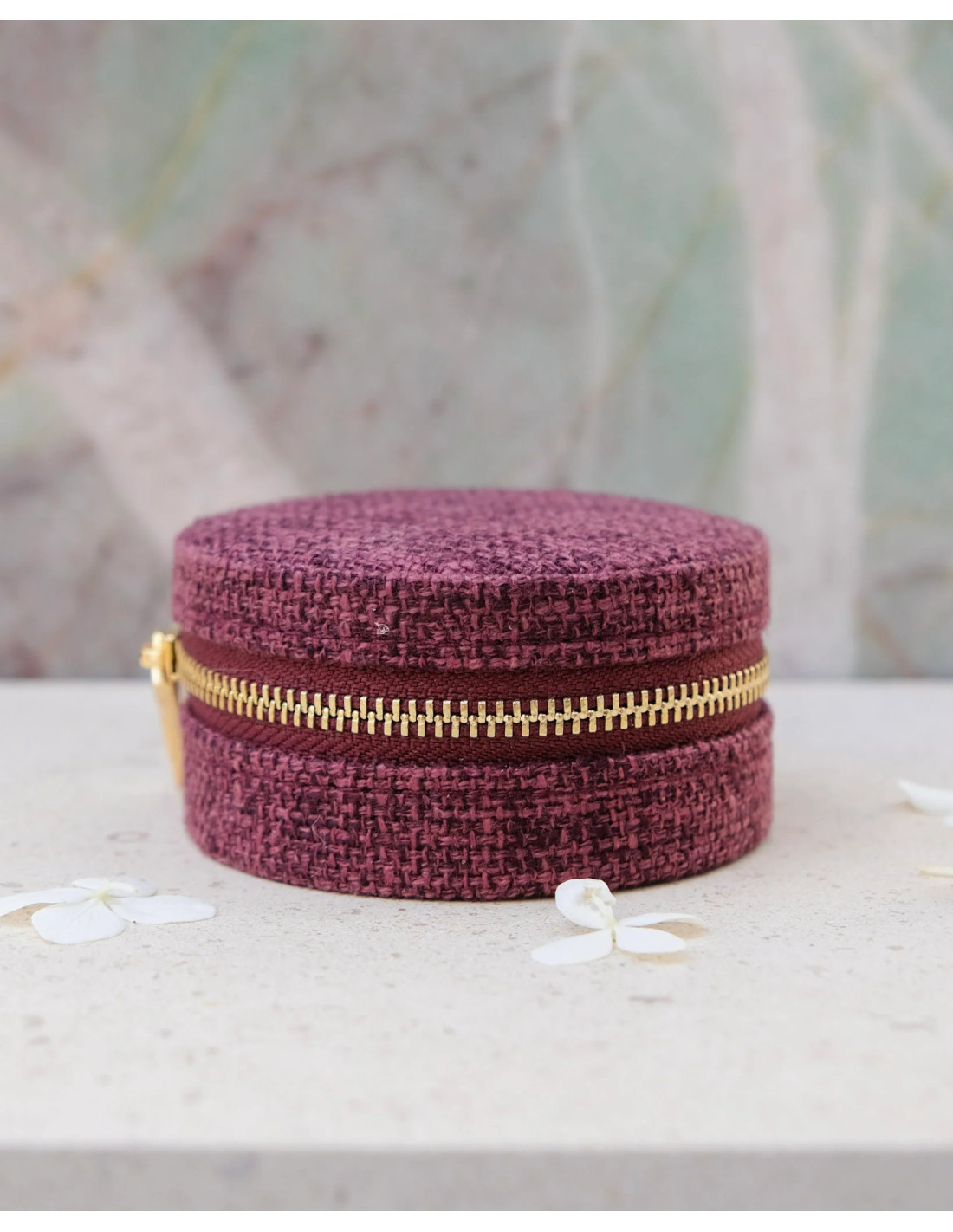 Kulatá cestovní šperkovnice ve vzhledu lnu - bordó | MAISON SCARLET a