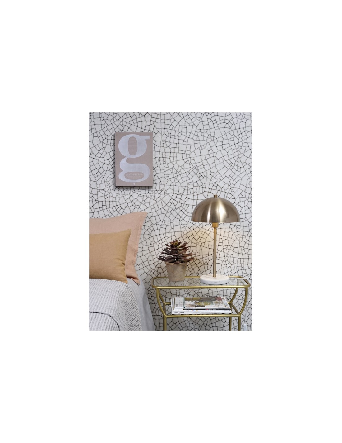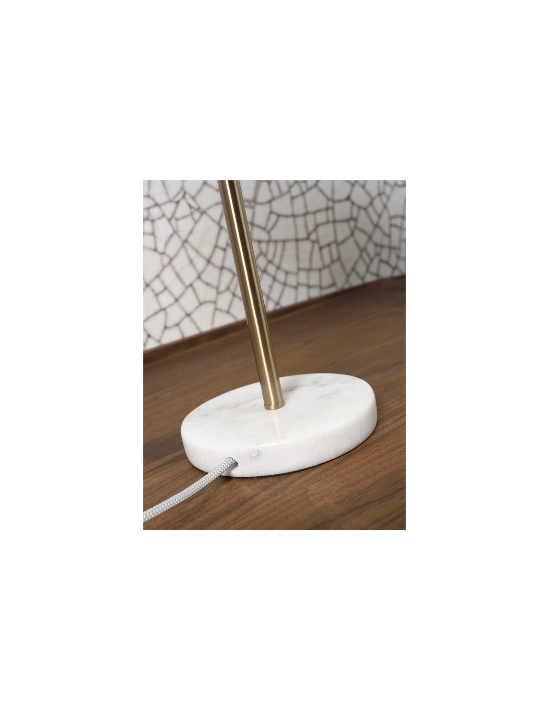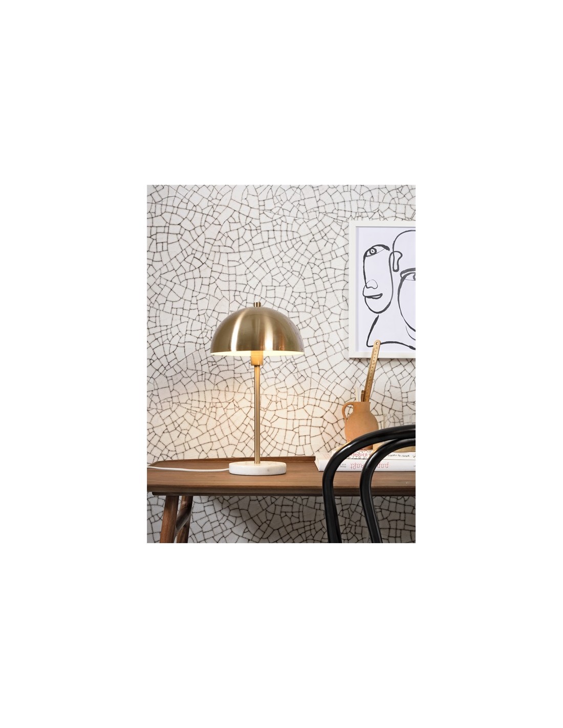 Elegantní lampa v lesklé zlaté barvě je doplněna mramorovou základnou. Půlkulaté stínítko je na vnitřní straně bílé a díky tomu krásně odráží a rozptyluje světlo. Lampa je krásným doplňkem každého interiéru ať rozsvícená, kdy zpříjemní podvečerní atmosféru nebo sama o sobě jako dekorace.