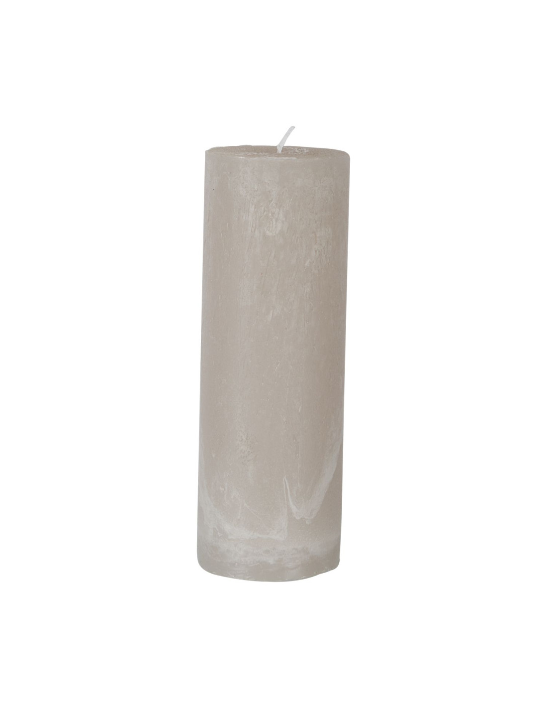 Kvalitní parafínová svíčka ve tvaru vysokého válce v příjenmé, světle šedé barvě.