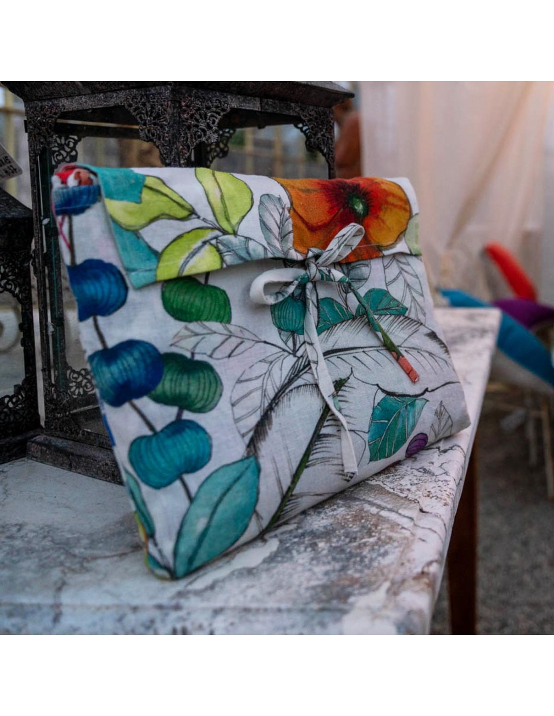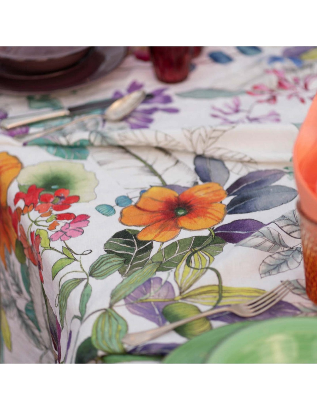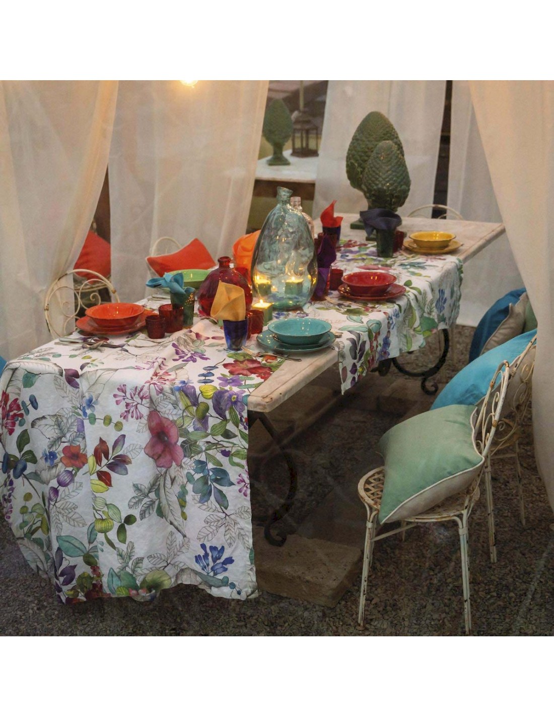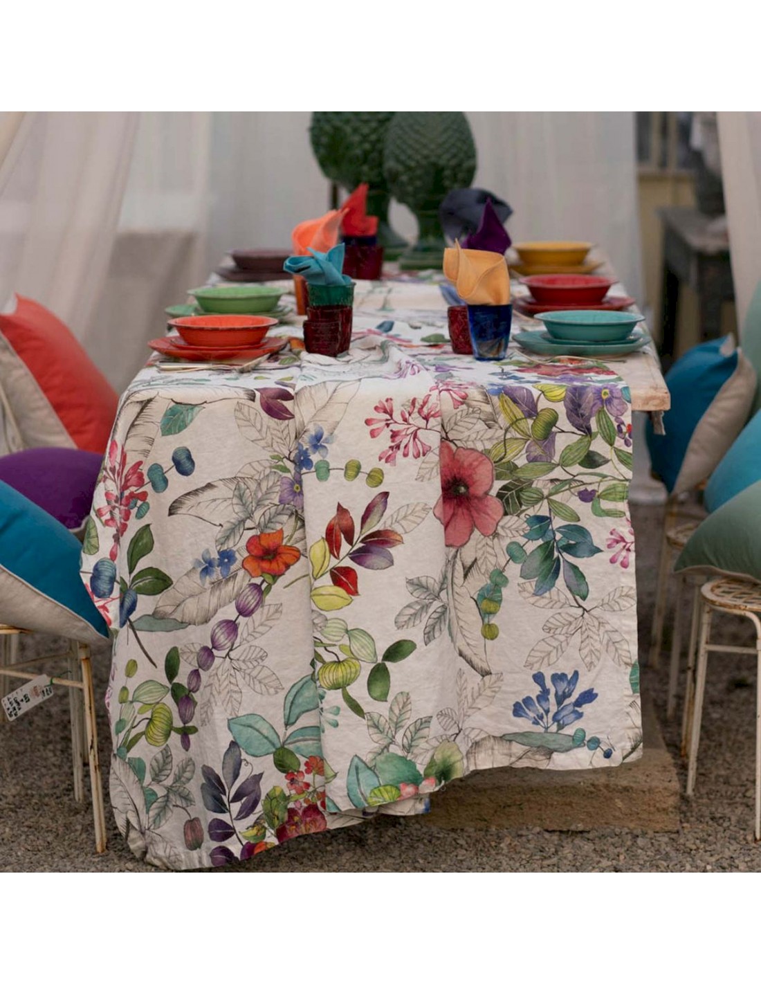 Obdélníkový ubrus s barevným vzorem "Maui" od firmy Tessitura Toscana Telerie. Tato známá toskánská značka nabízí ubrusy z přírodních materiálů, především lnu a konopí v neobyčejné kvalitě a ve velmi originálním provedení.