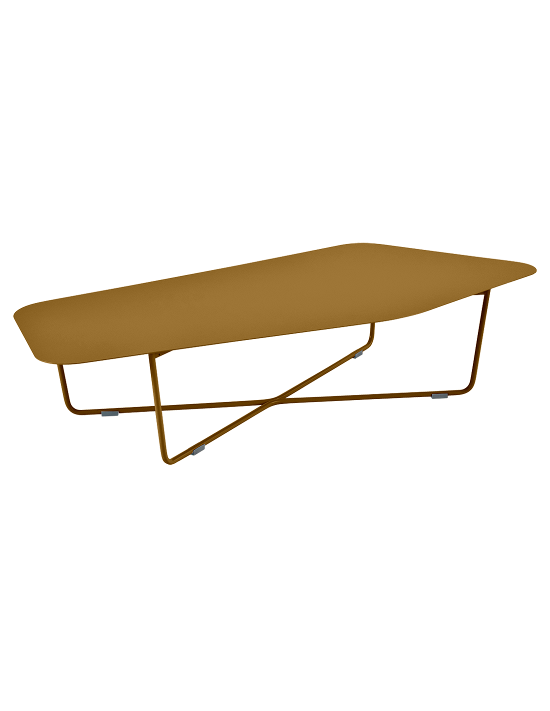 Nízký kovový stůl má asymetrické křivky a jednoduchou základnu, které mu dodávají jedinečnou identitu. Elegantní konferenční stůl, který bude vypadat dobře jak obývacím pokoji, tak venku na terase.