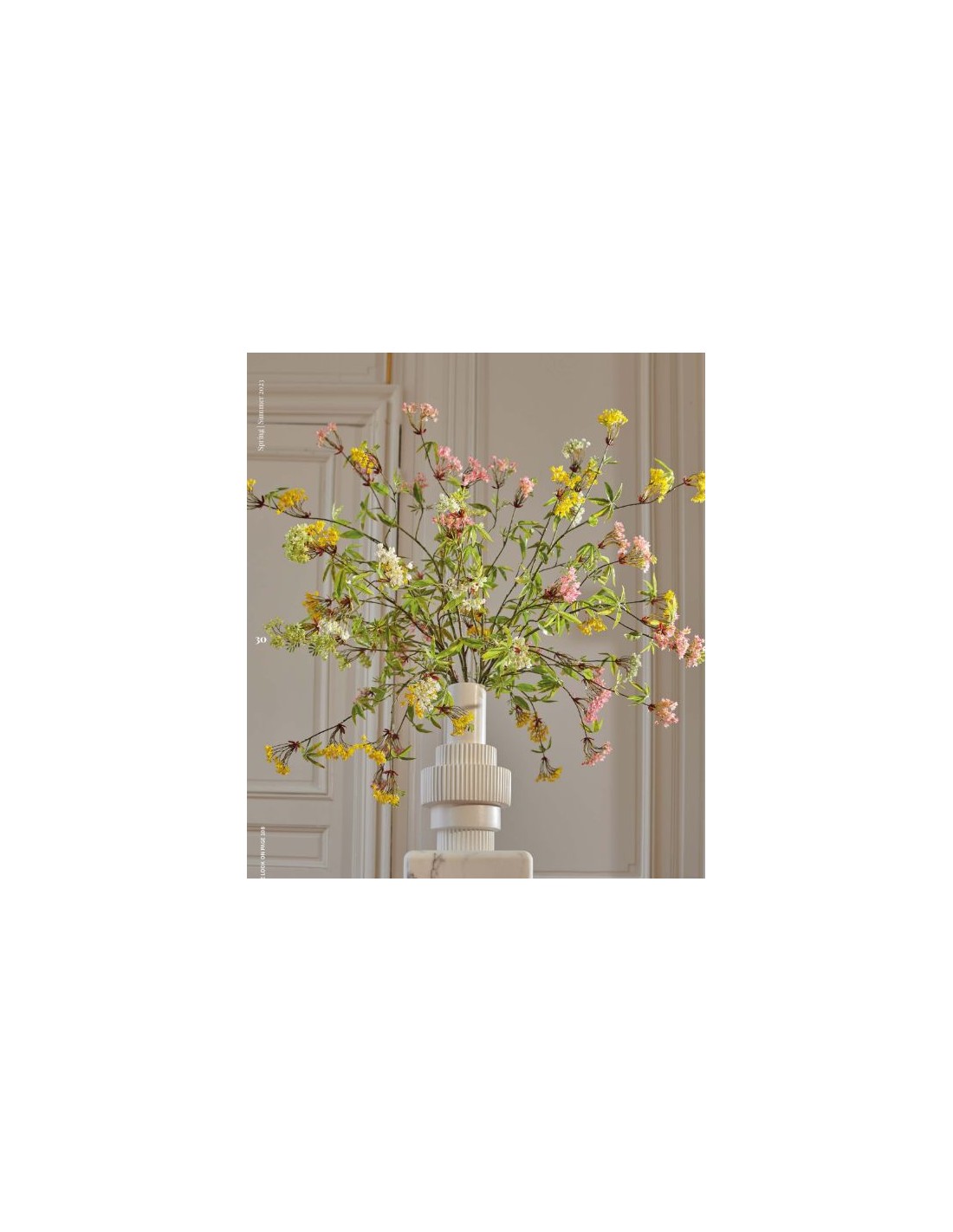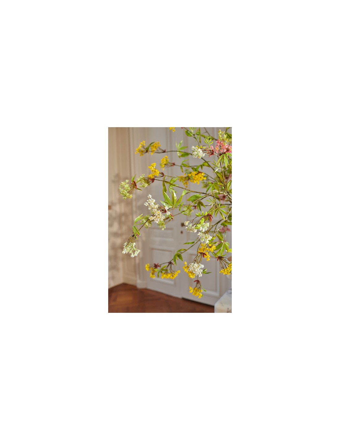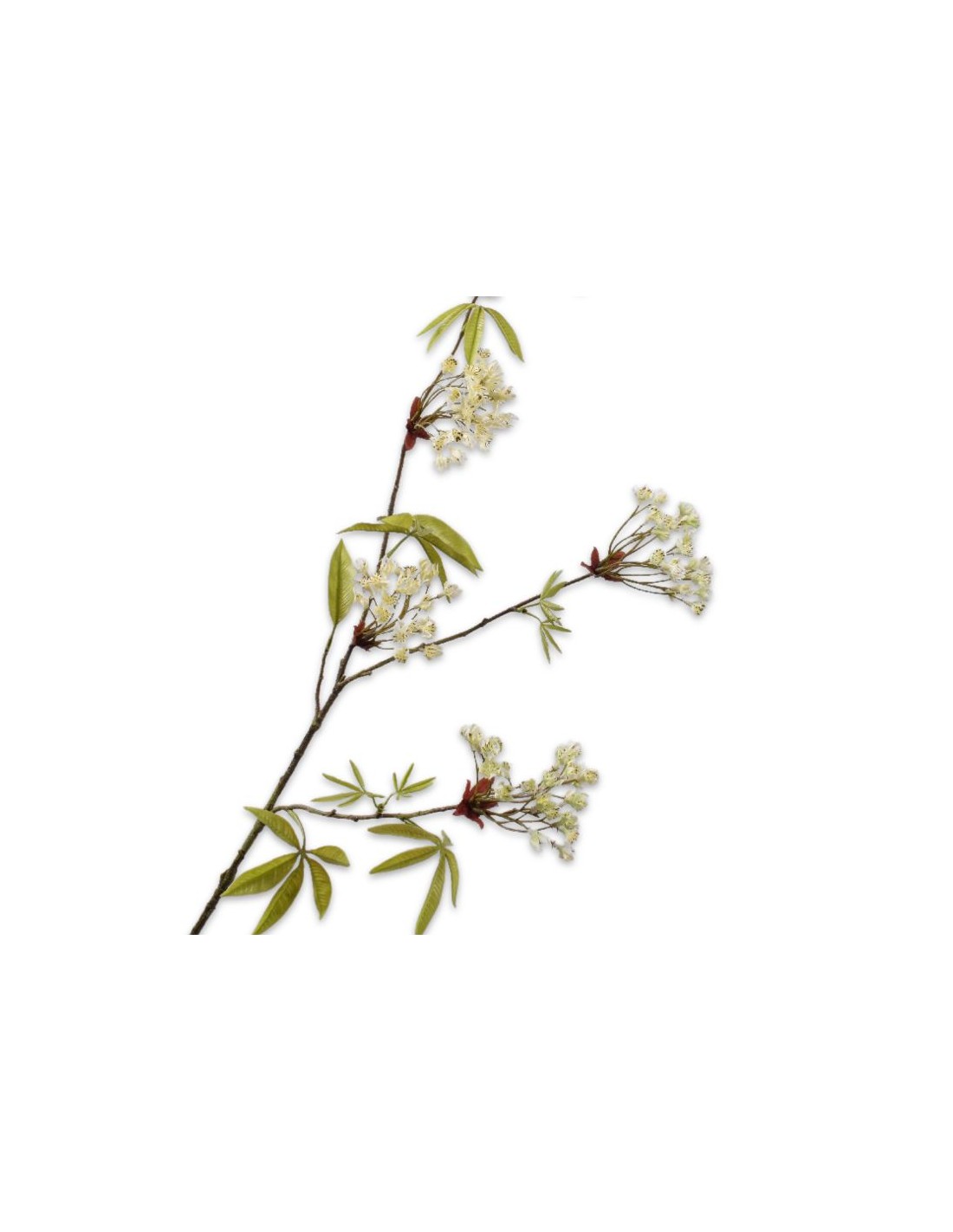 Umělá dekorativní větev kvetoucího javoru. Mladé, zelené lístky jsou doplněny krémovými květy. Věrohodně vypadající dekoraci můžete umístit buď samostatně, nebo v kompozici s jinými.