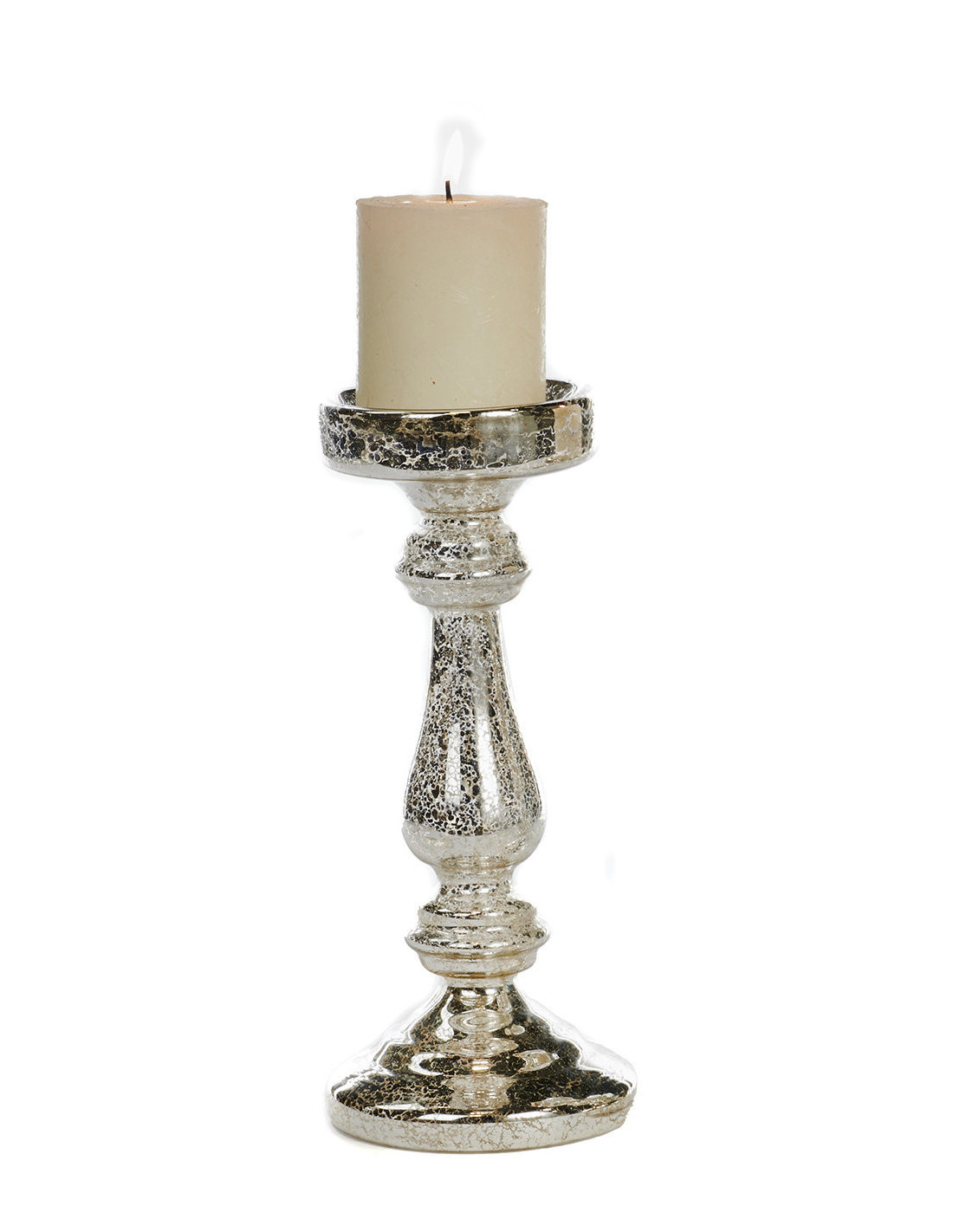Dekorativní svícen je vyroben z foukaného skla a je určen pro válcové svíčky nebo čajové svíčky ve skleněném kalíšku. Svícen s výraznou, tvarovanou nohou a s metalickým stříbrným povrchem s úpravou antik, která vytváří iluzi stáří a patiny s jemnými prasklinkami a fleky. Tento efekt dodává svícnu hloubku a sofistikovaný lesk. Je to ideální doplněk pro vytvoření luxusní zimní nebo vintage tabule.