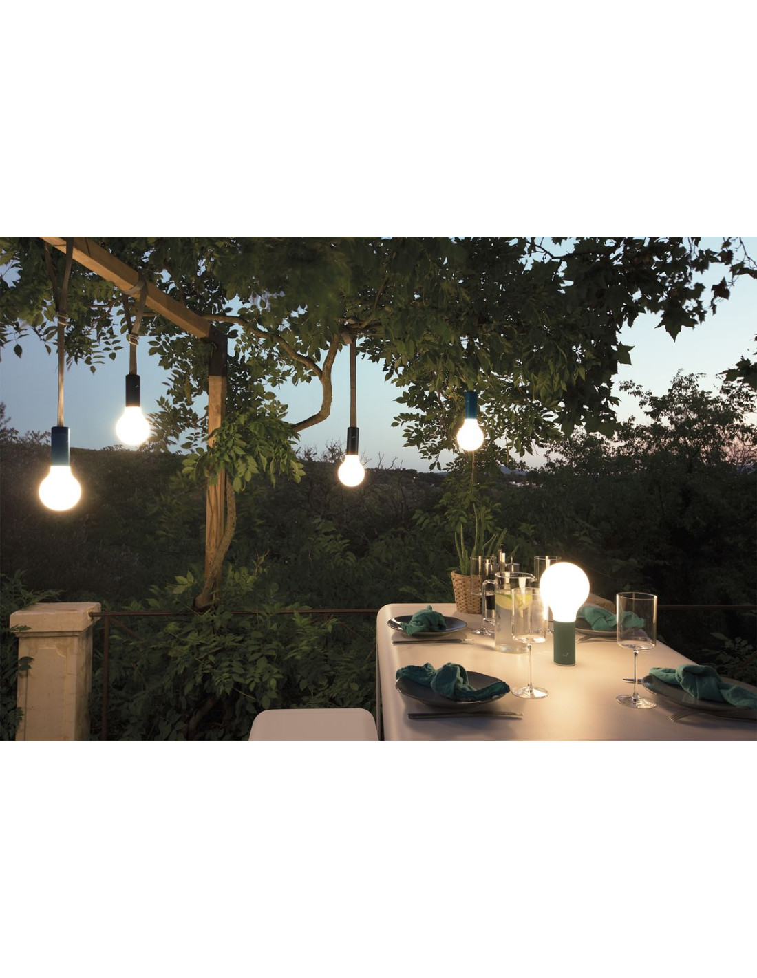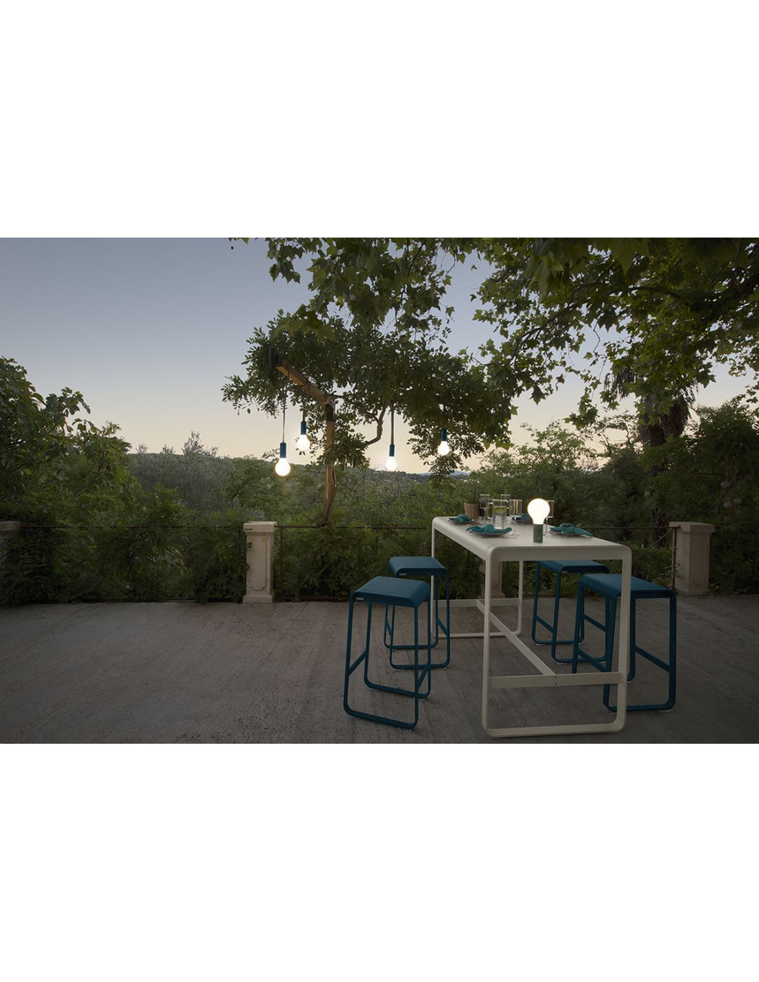 Závěsný popruh Aplô je vyroben z šedého polyesteru a je široký 3cm. Stejně jako ostatní produkty Fermob jsou popruh i hliníková základna vyrobeny tak, aby vydržely venkovní použití. To, co dělá toto příslušenství opravdu chytré, je nastavovací smyčka: použití je neuvěřitelně snadné a umožňuje vám nastavit lampu do správné výšky. Lampa Aplô se přišroubuje a vyšroubuje ze základny otočením o pouhou čtvrt otáčku. Pro vytvoření dokonale útulného koutu umístěte jednu z laviček Fermob pod vzrostlý strom. Ve dne si užijete jeho stín a stínohru jeho listů, když zapadne slunce, zavěste lampy Aplô na větve a prodlužte si večer dlouho do noci.