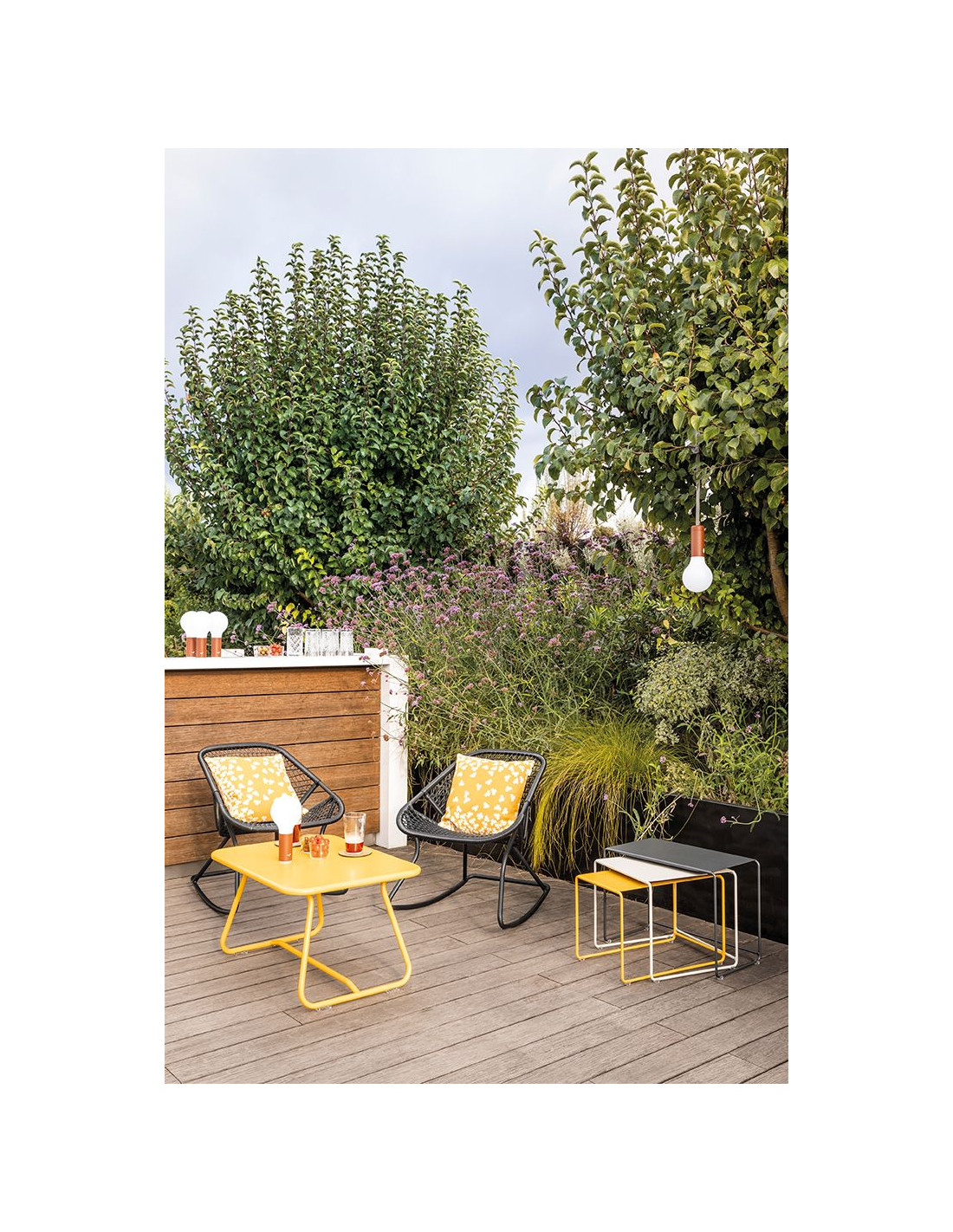 Závěsný popruh Aplô je vyroben z šedého polyesteru a je široký 3cm. Stejně jako ostatní produkty Fermob jsou popruh i hliníková základna vyrobeny tak, aby vydržely venkovní použití. To, co dělá toto příslušenství opravdu chytré, je nastavovací smyčka: použití je neuvěřitelně snadné a umožňuje vám nastavit lampu do správné výšky. Lampa Aplô se přišroubuje a vyšroubuje ze základny otočením o pouhou čtvrt otáčku. Pro vytvoření dokonale útulného koutu umístěte jednu z laviček Fermob pod vzrostlý strom. Ve dne si užijete jeho stín a stínohru jeho listů, když zapadne slunce, zavěste lampy Aplô na větve a prodlužte si večer dlouho do noci.