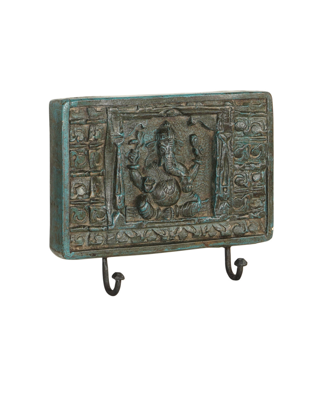 Dřevěný věšák na zeď z masivního dřeva s vyřezávaným motivem boha Ganéši, symbolu moudrosti, štěstí a překonávání překážek. Povrch věšáku má patinou v odstínu petrolejově modré, která podtrhuje jeho autentický vintage vzhled. Dva kovové háčky ve spodní části poskytují praktické místo pro zavěšení klíčů, šperků, drobných doplňků a oblečení. Je ideální do předsíně, ložnice nebo pracovny, kde se stane originální dekorací a zároveň funkčním prvkem.