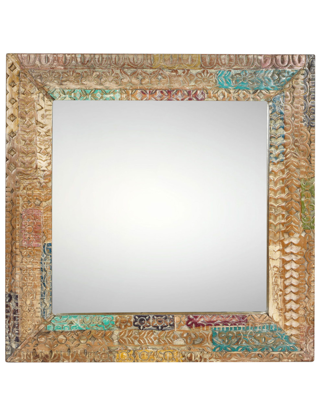 Stylové zrcadlo s dřevěným rámem zdobeným ručně vyřezávaným motivem a barevnou patinou, která mu dodává jedinečný, lehce vintage charakter. Skvěle se hodí jako výrazný prvek do chodby, ložnice či obývacího pokoje – opticky zvětší prostor a zároveň působí jako dekorace.