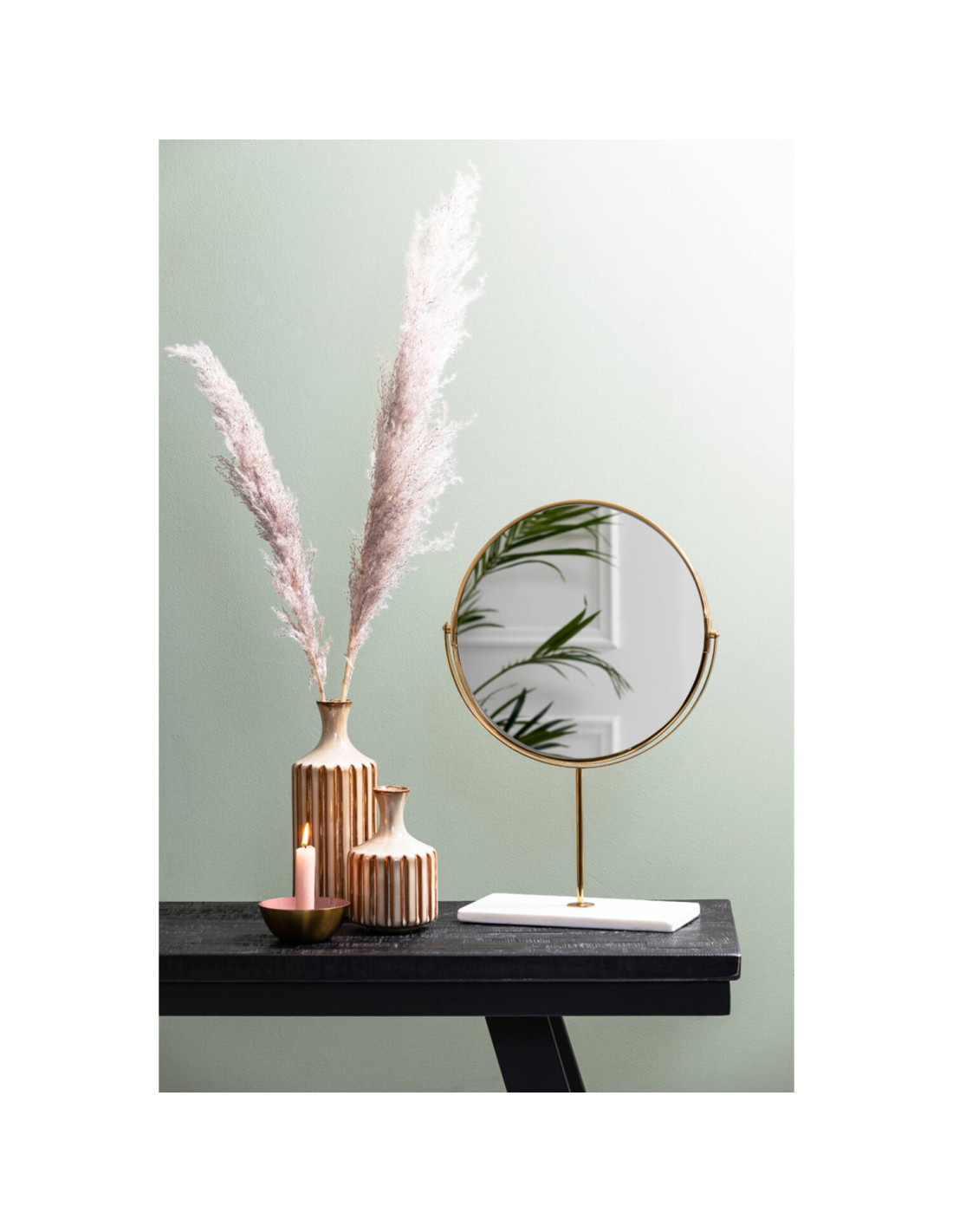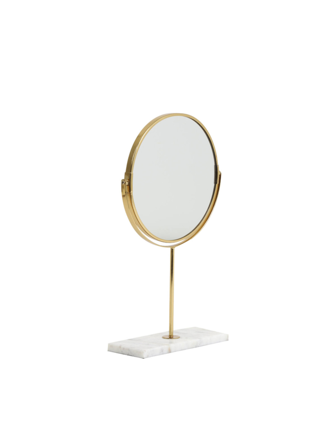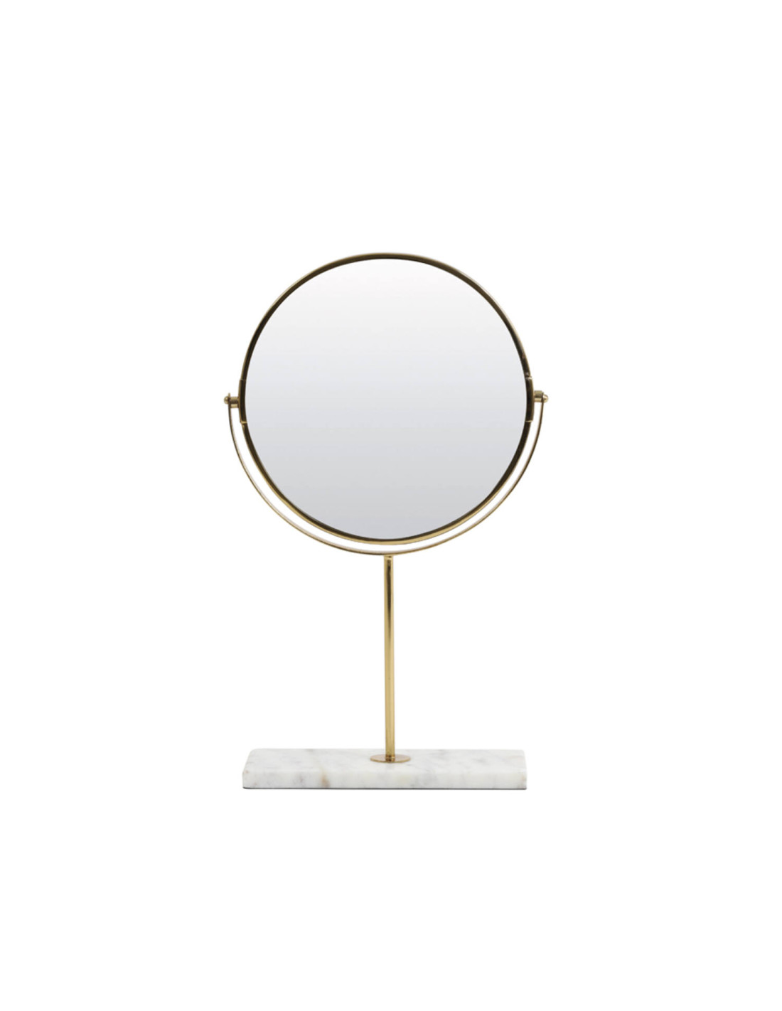 Elegantní stolní zrcátko na podstavci vyniká kombinací bílého mramoru a zlatých detailů, které dodávají celku luxusní a nadčasový vzhled. Stabilní základna z mramoru zajišťuje pevnost a zároveň působí jako výrazný dekorativní prvek.