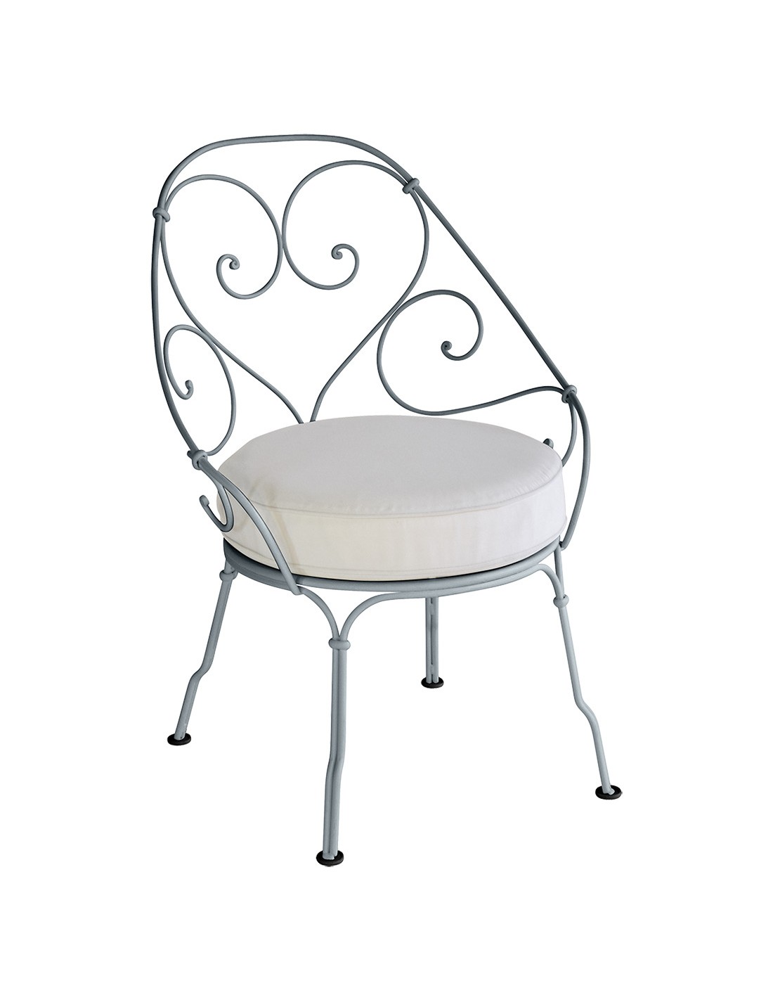 The wrought-iron armchair in the romantic design of the lines of the backrest and fine perforation on the seat, offers the true elegance of the Belle Epoque. Whether you place the armchair under a cherry tree in the garden, on a city balcony, or in the living room, you can create a wonderful, stylish set with a low table from the same series. The chair is produced in many color shades and is supplemented with a seat for outdoor use.