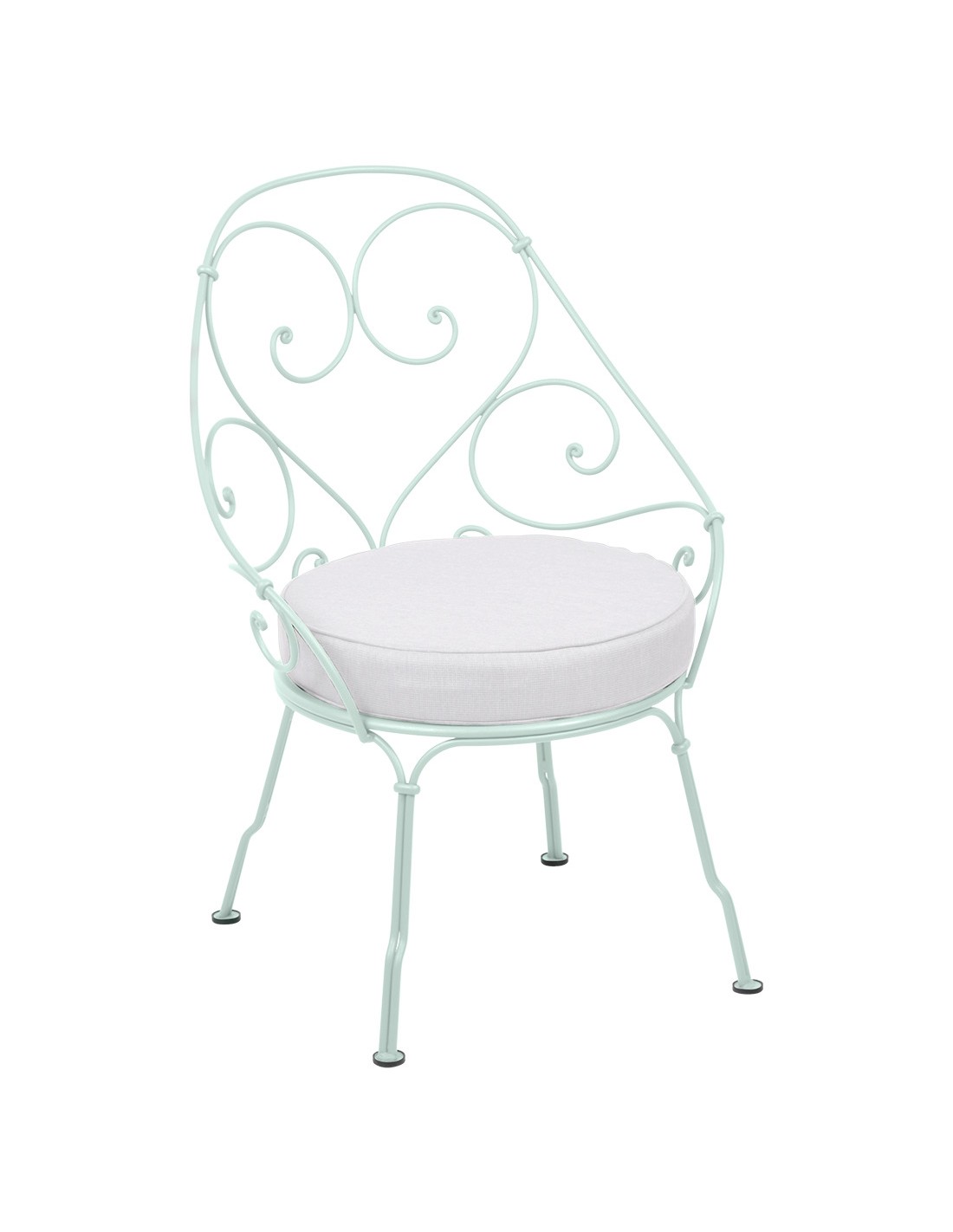 The wrought-iron armchair in the romantic design of the lines of the backrest and fine perforation on the seat, offers the true elegance of the Belle Epoque. Whether you place the armchair under a cherry tree in the garden, on a city balcony, or in the living room, you can create a wonderful, stylish set with a low table from the same series. The chair is produced in many color shades and is supplemented with a seat for outdoor use.