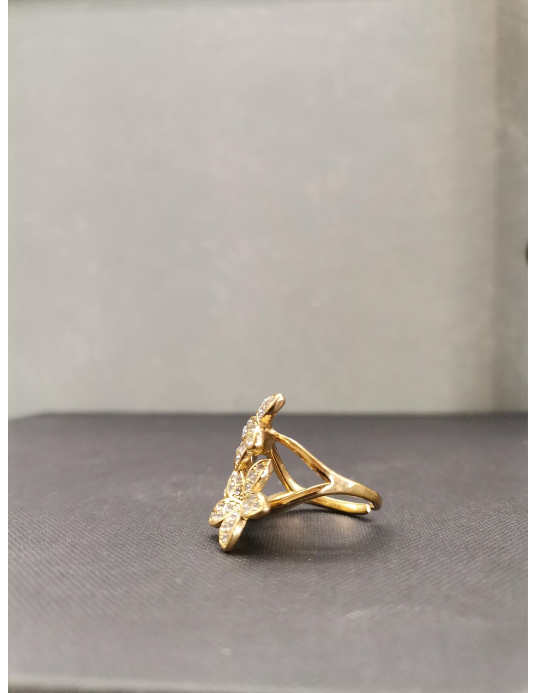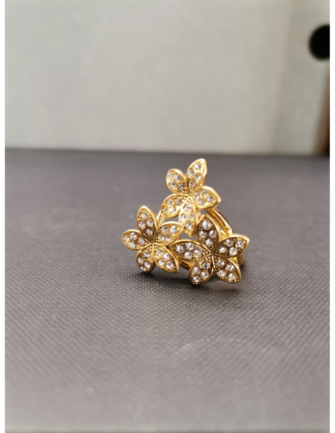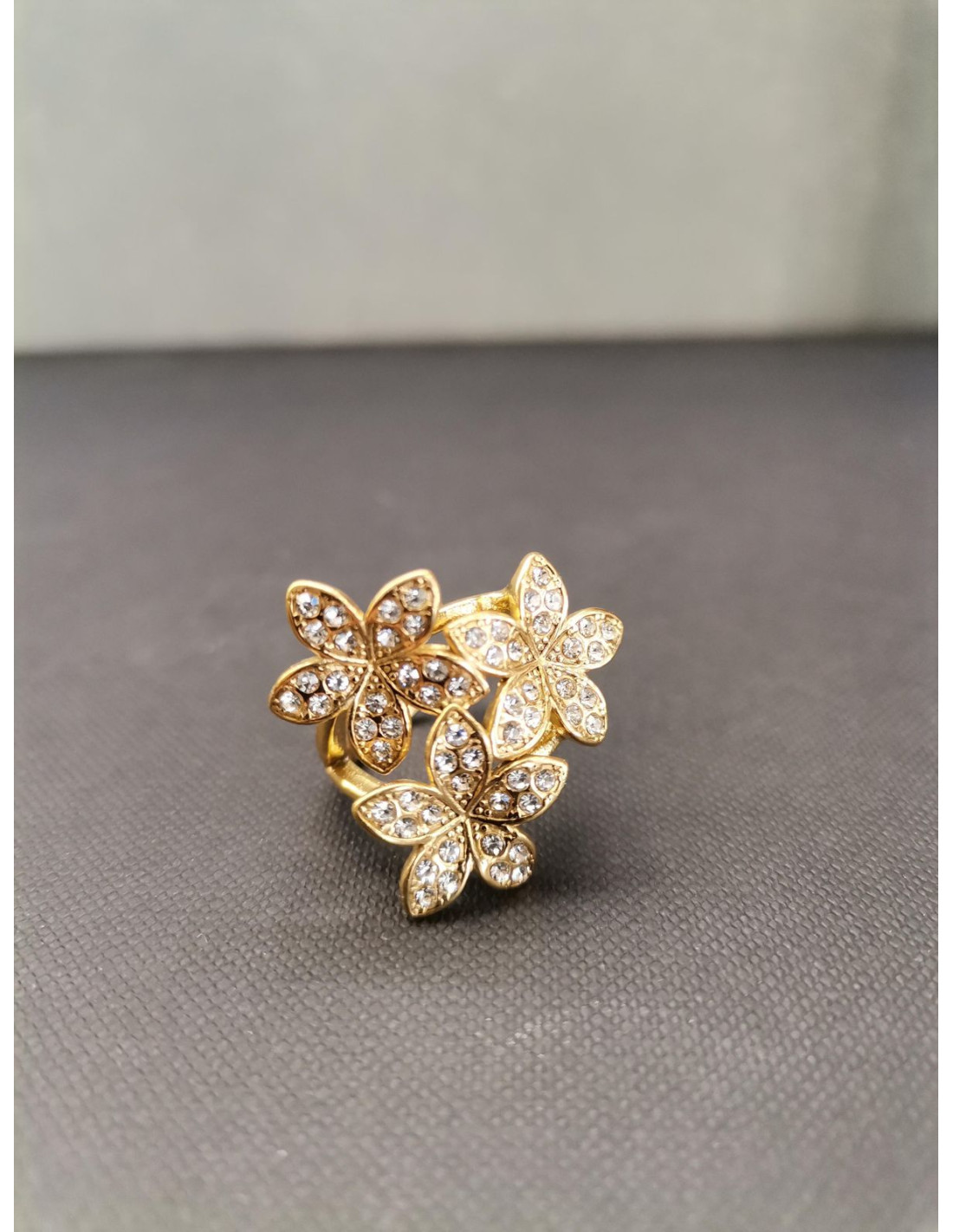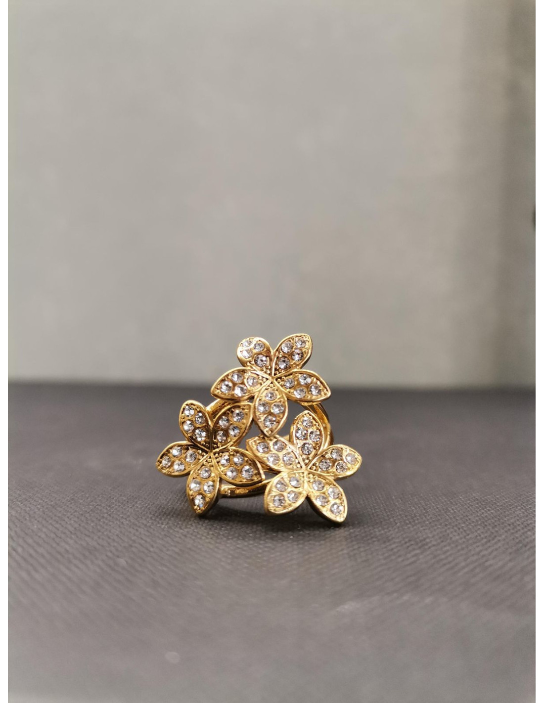 Beautiful and decorative ring with a motif of three flowers, which are decorated with sparkling rhinestones. This elegant and distinctive ring in gold is a novelty of the limited collections of the Piou Piou brand.
