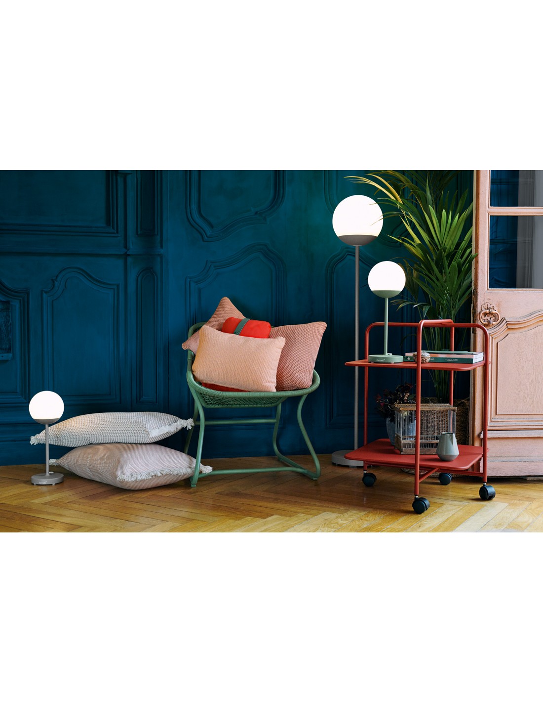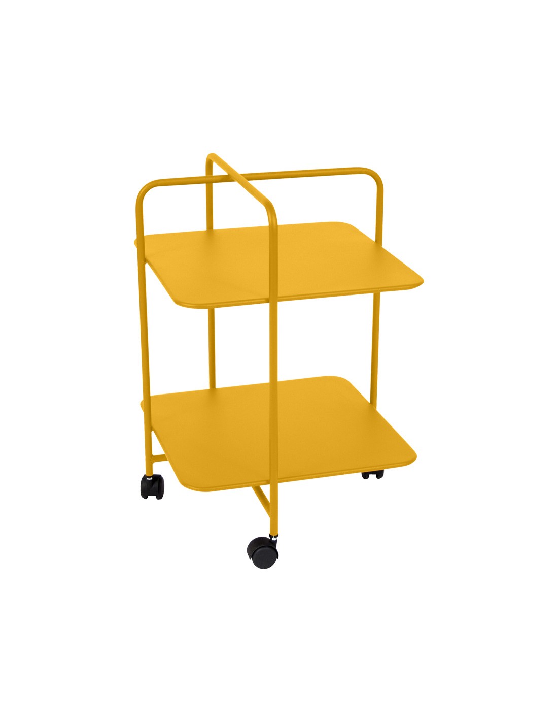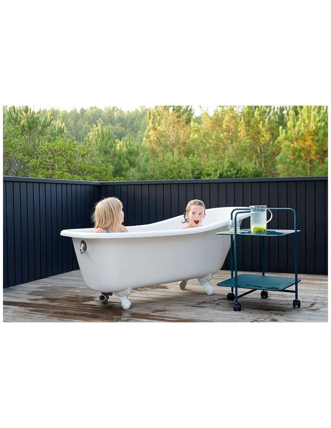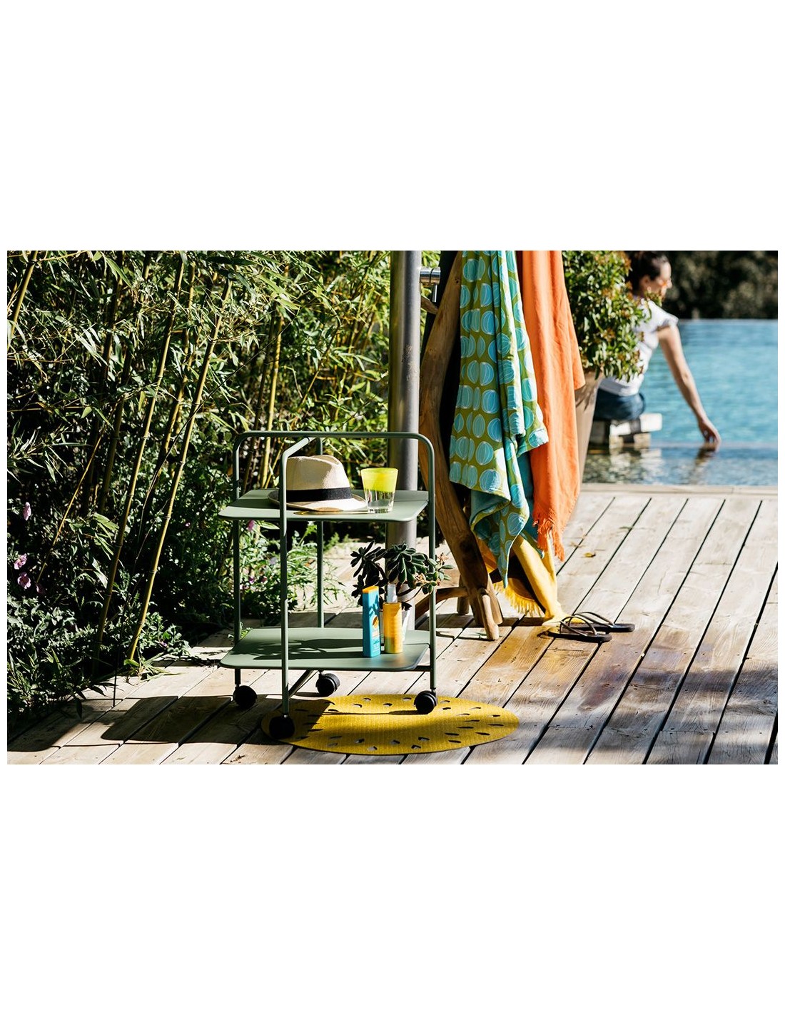 The Alfred table boasts an attractive, asymmetrical design – not surprising when you consider that it is the work of Pascal Mourgue, a designer whose relationship with Fermob goes back a long way and which won the Grand Prix de la Création. This easily portable furniture fits into every corner of the house or garden. Just imagine how good it will look! With a clean look inspired by the 1950s, the table is easy to move thanks to the handle and integrated wheels. It's a versatile piece of small furniture that you can use to store (and transport) plates, magazines, or plants, and that can function as a side bar in the office or on the patio, or even as a minibar. This metal table is suitable for both indoor and outdoor use, as it is specially treated to withstand adverse weather conditions.