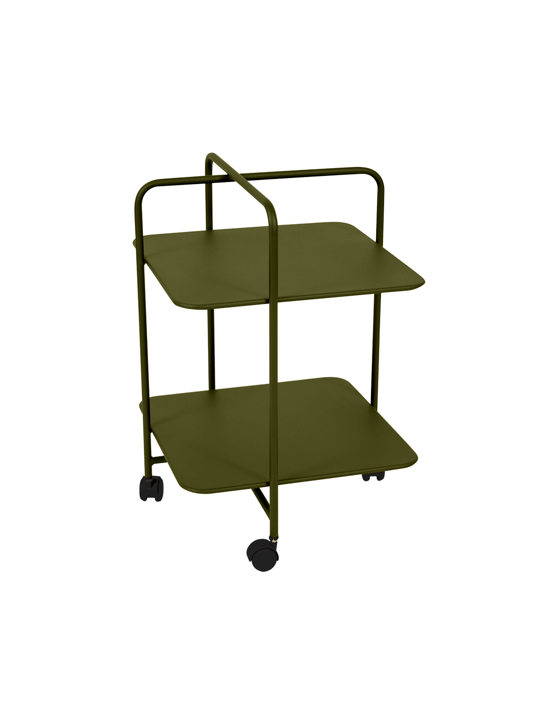 The Alfred table boasts an attractive, asymmetrical design – not surprising when you consider that it is the work of Pascal Mourgue, a designer whose relationship with Fermob goes back a long way and which won the Grand Prix de la Création. This easily portable furniture fits into every corner of the house or garden. Just imagine how good it will look! With a clean look inspired by the 1950s, the table is easy to move thanks to the handle and integrated wheels. It's a versatile piece of small furniture that you can use to store (and transport) plates, magazines, or plants, and that can function as a side bar in the office or on the patio, or even as a minibar. This metal table is suitable for both indoor and outdoor use, as it is specially treated to withstand adverse weather conditions.