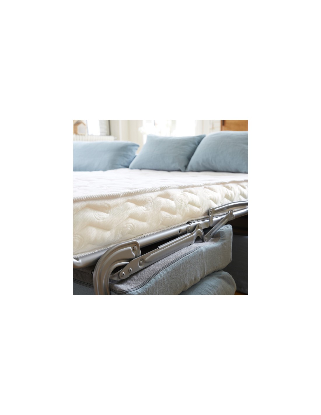 We offer you a comfortable small Bidart sofa with a thick linen cover. Backing is provided by a large pillow filled with feathers and 2 smaller pillows measuring 40x40cm. High-quality PUR foam with a layer of feathers gives you a comfortable seat. With the Grand Confort folding mechanism, you can easily fold the seat into a comfortable bed with a 14 cm high mattress.