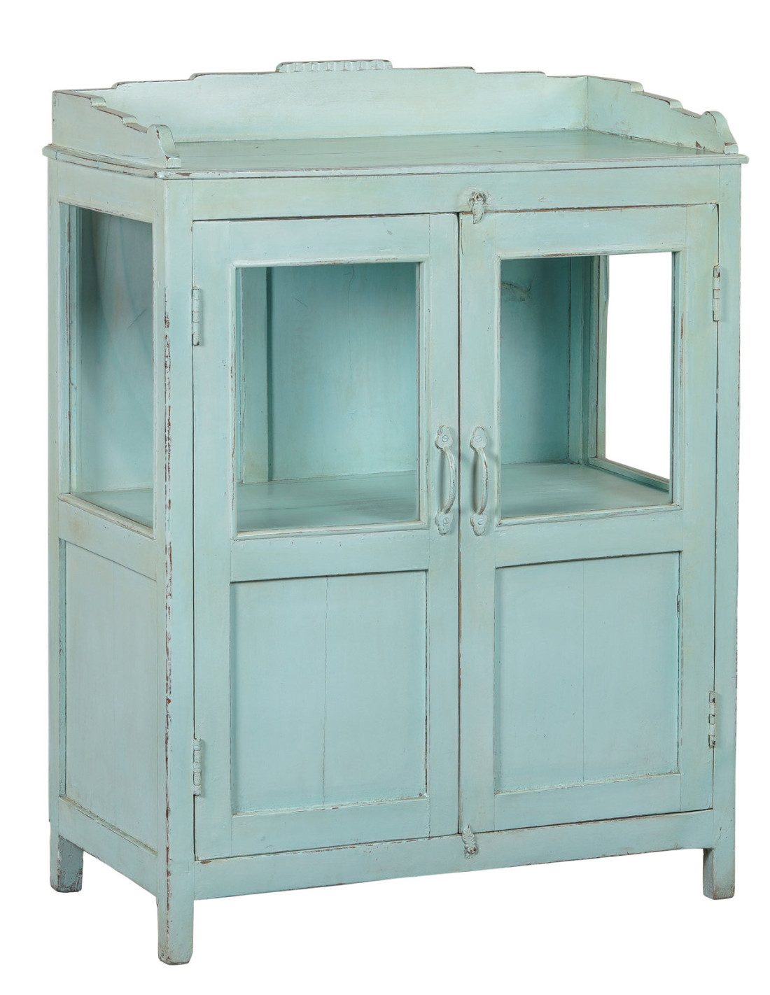 This charming antique solid teak cabinet boasts a unique patinated pastel finish that gives it a distinctive vintage look. It features two glass doors with metal handles that allow you to display your favourite items, while the enclosed lower sections offer discreet storage space. Subtle paint wear highlights the authentic character and history of the piece, perfect for interiors that desire an original and colourful accessory with soul. The cabinet is perfect for the living room, dining room or hallway.