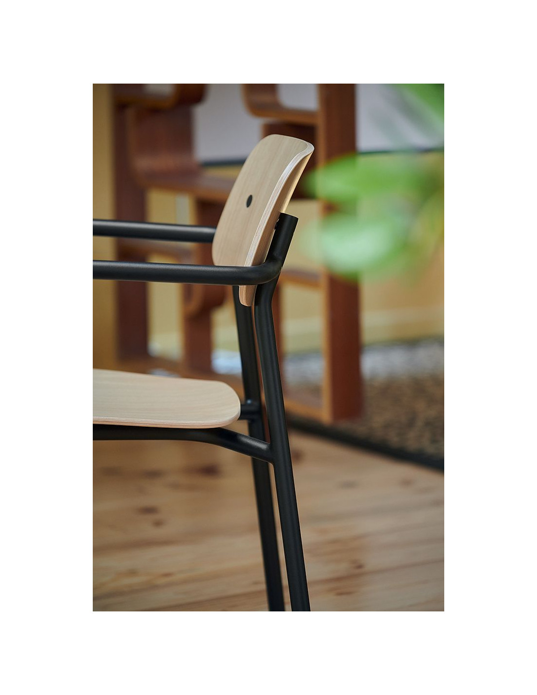 The minimalist design shape of the Studie Oak chair is an interior variant on the Studie chair. Although this chair is inspired by school chairs, it has been significantly modernised in terms of comfort. The moulded oak seat and backrest have curves that conform to the shape of the body, ensuring comfortable seating at the dining table and in the study. Thanks to the aluminium construction, the chair is lightweight and stackable. The chair is available in a variety of metal colours, which are combined with natural wood.