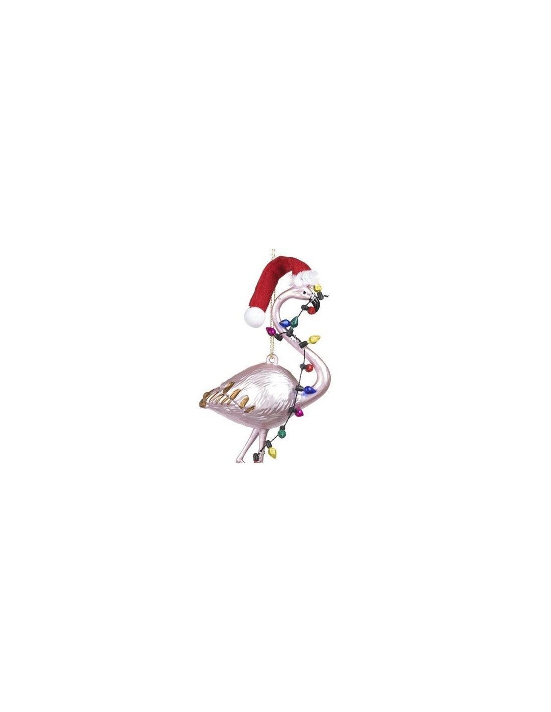 A funky Christmas decoration that is guaranteed to brighten up your festive decorations. Light pink flamingo with Christmas decoration - colourful garland and Santa hat.