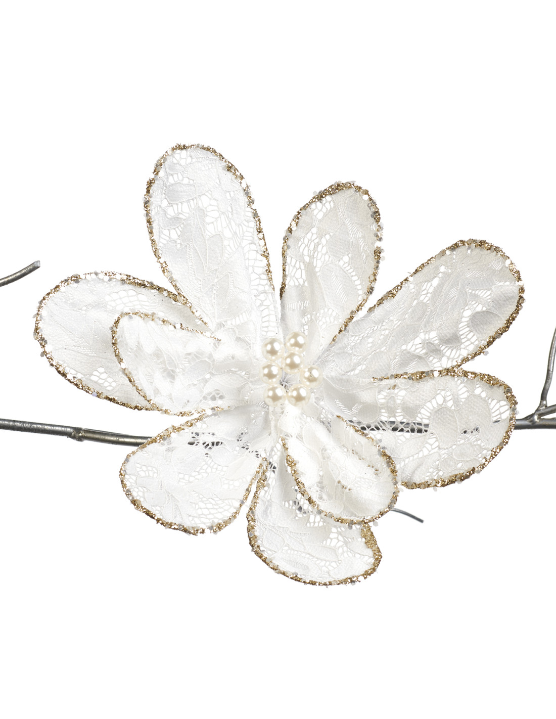 You can place the decorative flower directly on the Christmas tree or anywhere indoors, simply fix it with a clip. Lace flower in white with a shimmering gold edge and white pearls. The petals with embossed decoration can be gently shaped thanks to the wires hidden underneath.