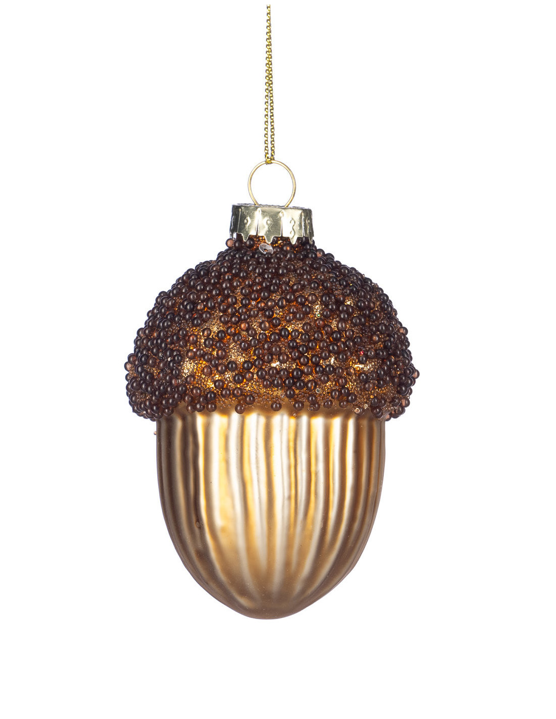 The elegant acorn-shaped hanging ornament is made of blown glass and combines rich texture with warm colours. The bottom part imitating a fruit is coated with a shiny, metallic bronze colour and is decorated with fine, vertical striations. The top part, the cap, is richly studded with tiny brown beads, creating a sculptural and sparkling surface. This ornament will make a charming and sophisticated addition to Christmas decorations in natural, vintage or golden tones.