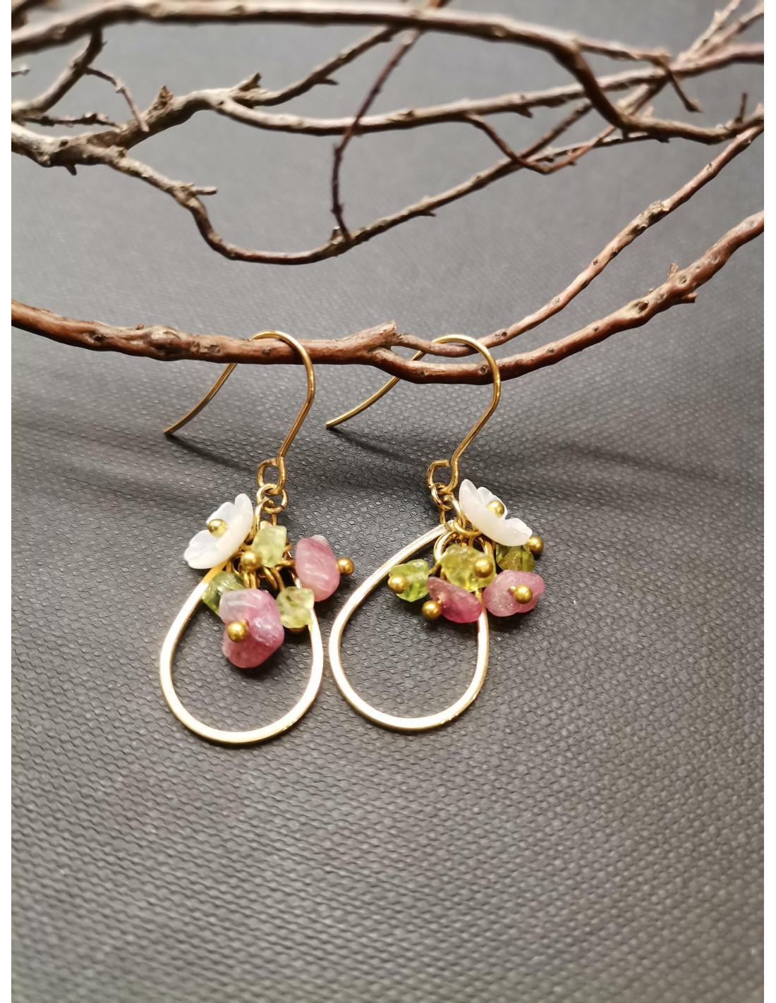 Earrings with flower trimmings with tourmaline and mother of pearl. The earrings are gold in colour and have a hook fastening and a silicone pendant.