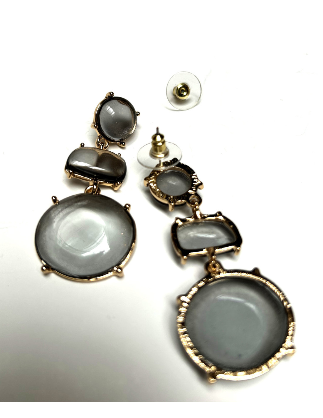 Elegant dangle earrings with a composite trim of translucent grey stones set in a gold frame. The earrings have a button fastening.