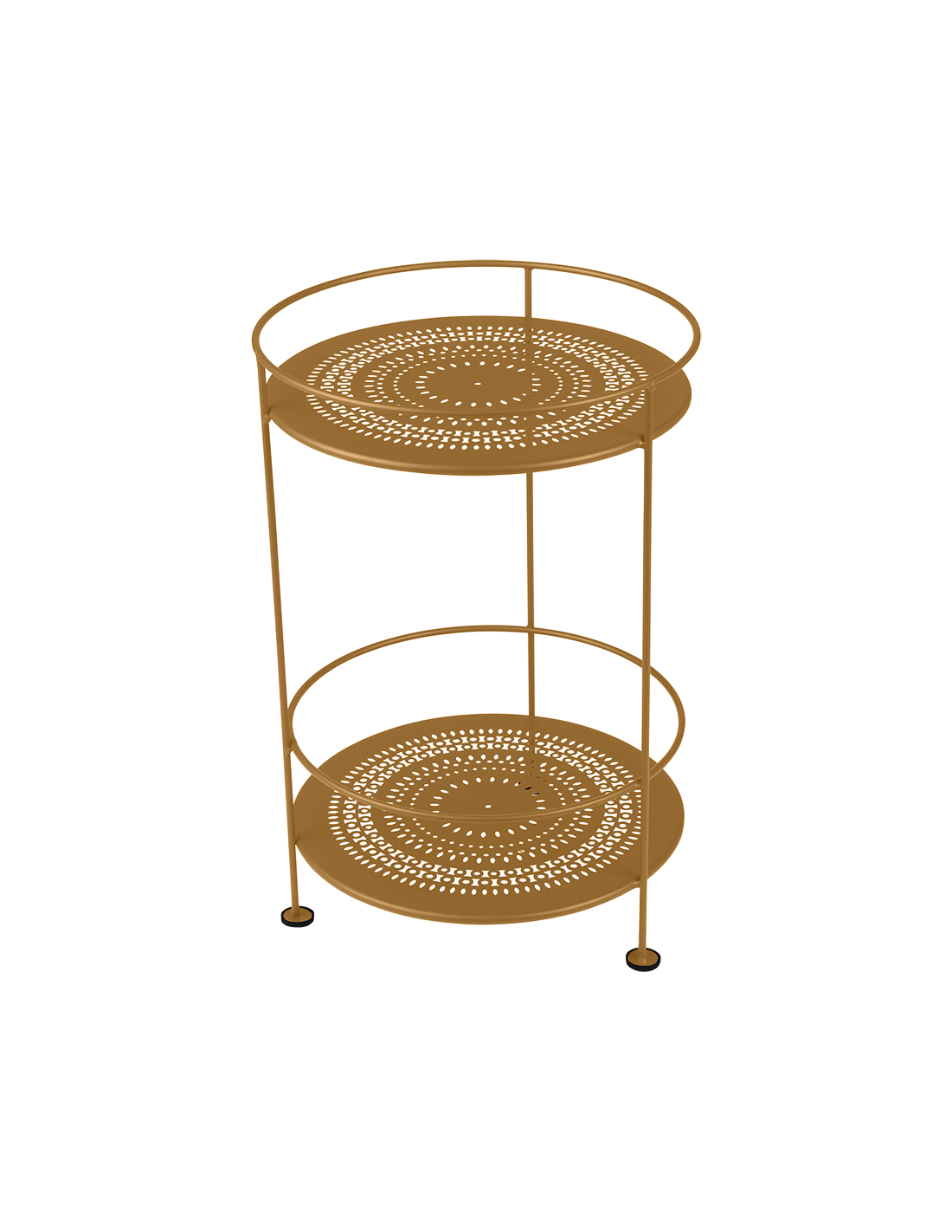Practical, metal storage table with perforations on the top and bottom. Raised edges secure drinks and other items, the table can serve as a mini-bar or can be placed on top of a vase of flowers, for example. Its great advantage is its lightness, which makes it easy to move wherever you need it. The table can be used both indoors and outdoors.