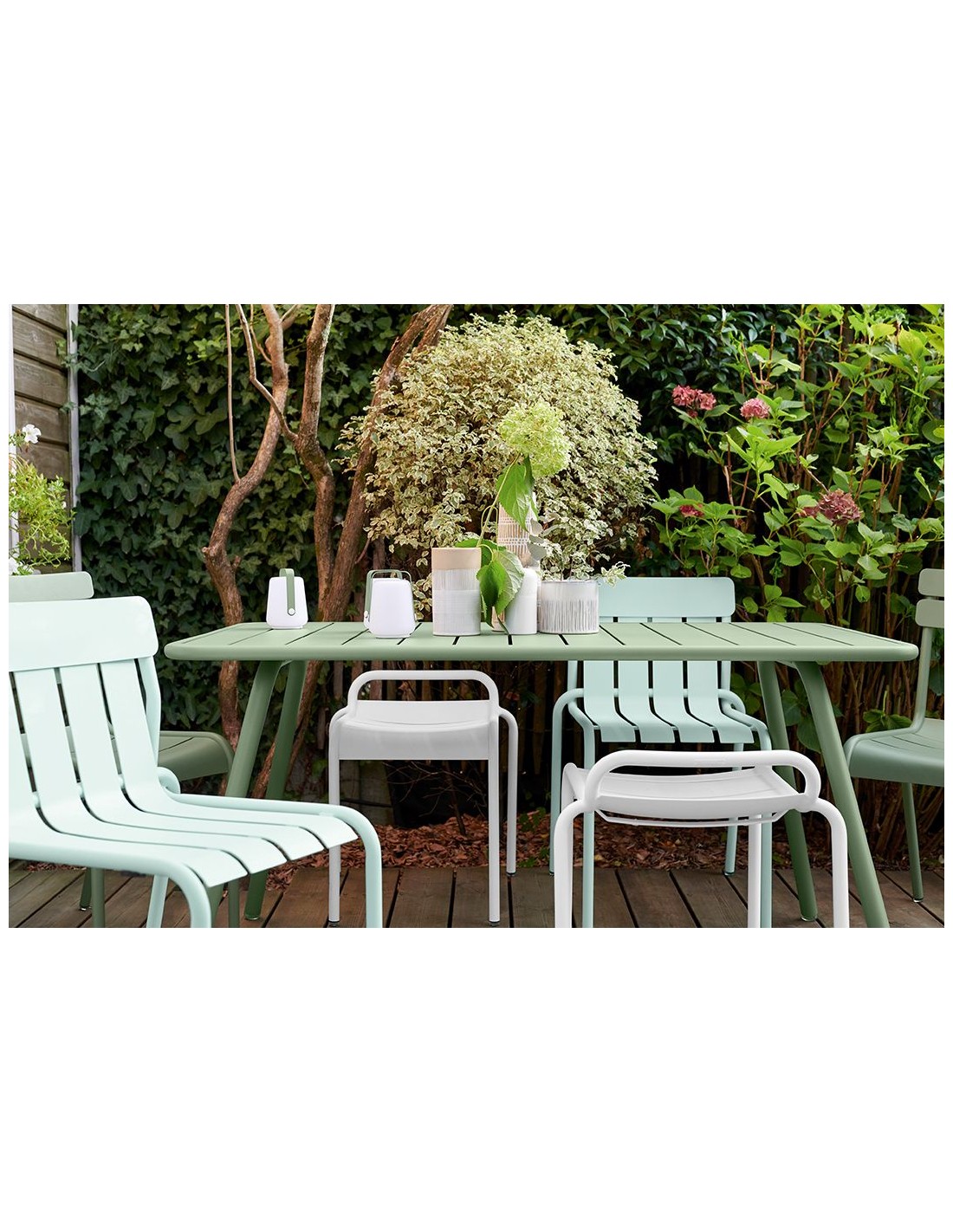 This garden table with its clean, simple lines will be the ideal place to gather with family and friends. The size is suitable for 6 people. It is made to last for many years and withstand weather changes. It is lightweight so you can easily move it around, the top is composed of aluminium slats which are typical of this range. In the centre of the table top there is a hole for an umbrella to protect you from the sun. If you complement it with the chairs from the Luxembourg range you get comfortable and stylish seating for the garden and the terrace. Most of the garden furniture can be made in all Fermob colours, you can arrange everything in one colour or, on the contrary, choose a playful and colourful combination.
