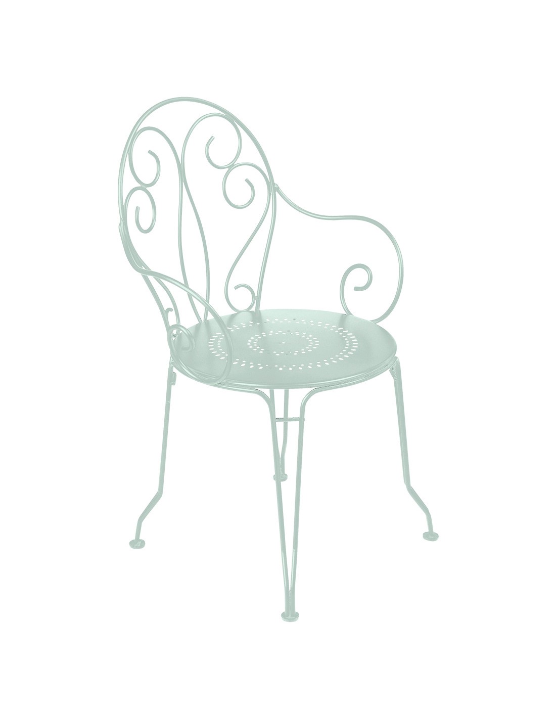 Garden chair with arms Montmartre is based on traditional French design, which brings not only a romantic look, all the comfort, but also practicality, in the possibility of stackability, you can stack up to 7 chairs. The twisted steel rod backrest and armrests are complemented by a smooth, ample perforated seat. The chair can be fitted with a round outdoor seat cushion from the Basic series with a diameter of 43 cm or from the Color Mix series with a diameter of 39 cm. The armchair is available in many colours.