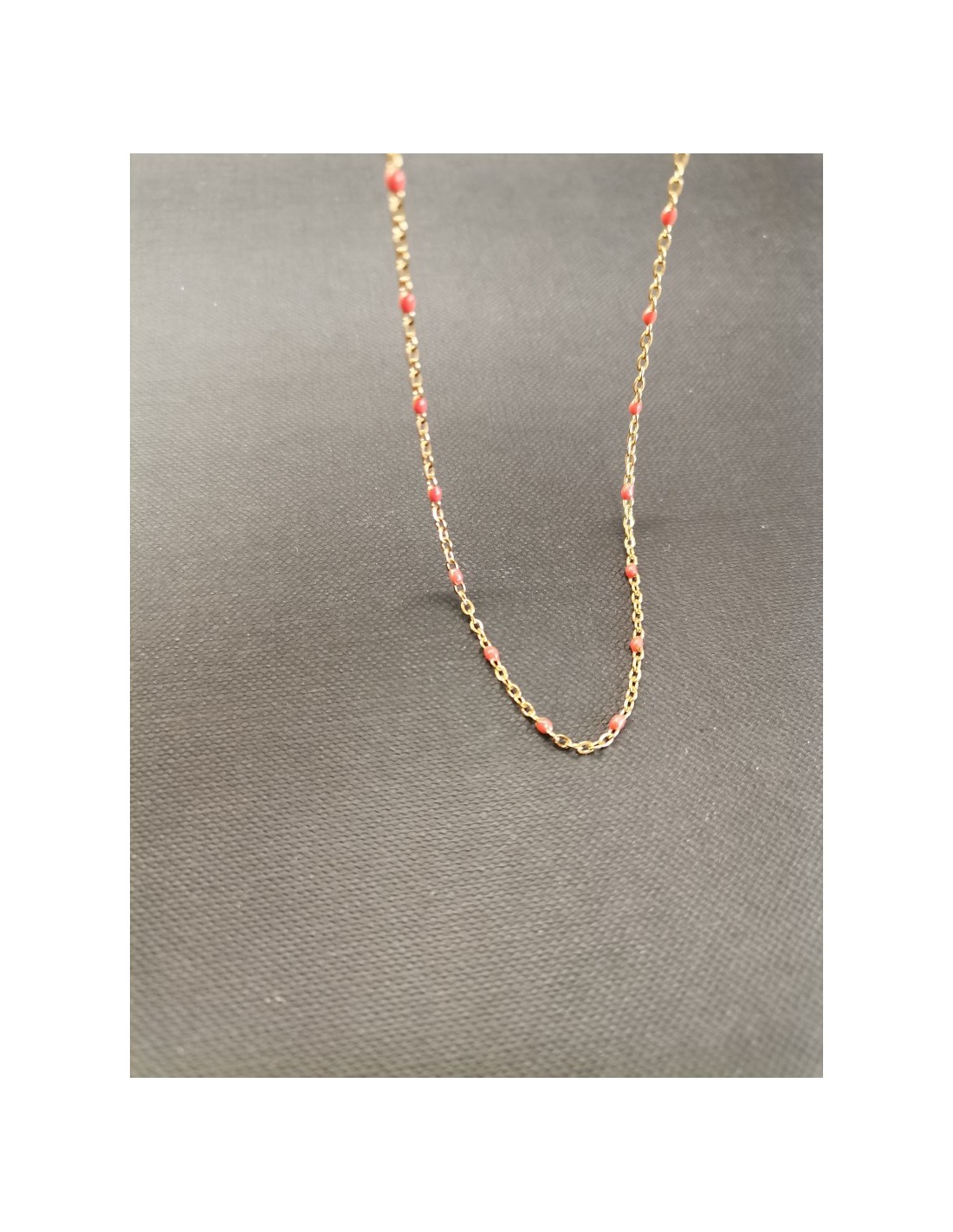 Delicate chain in gold colour with colourful details in the form of red "beads". The chain has a carabiner fastening. The total length of the chain is 41,5cm with the possibility of extension by 2,5cm.