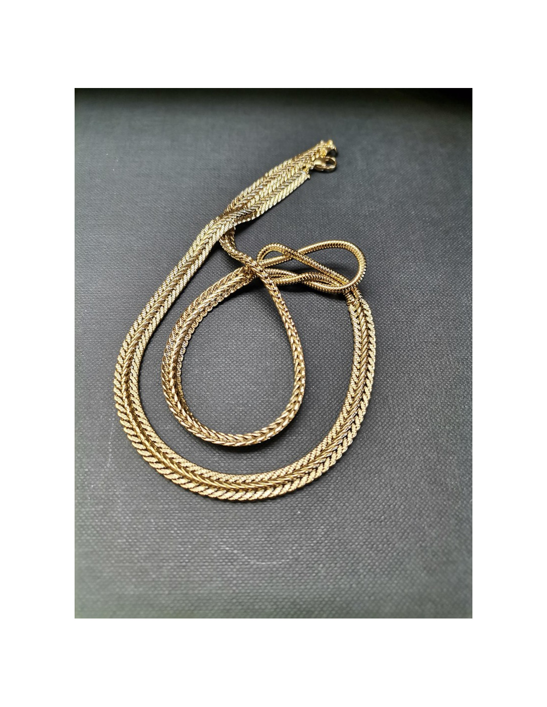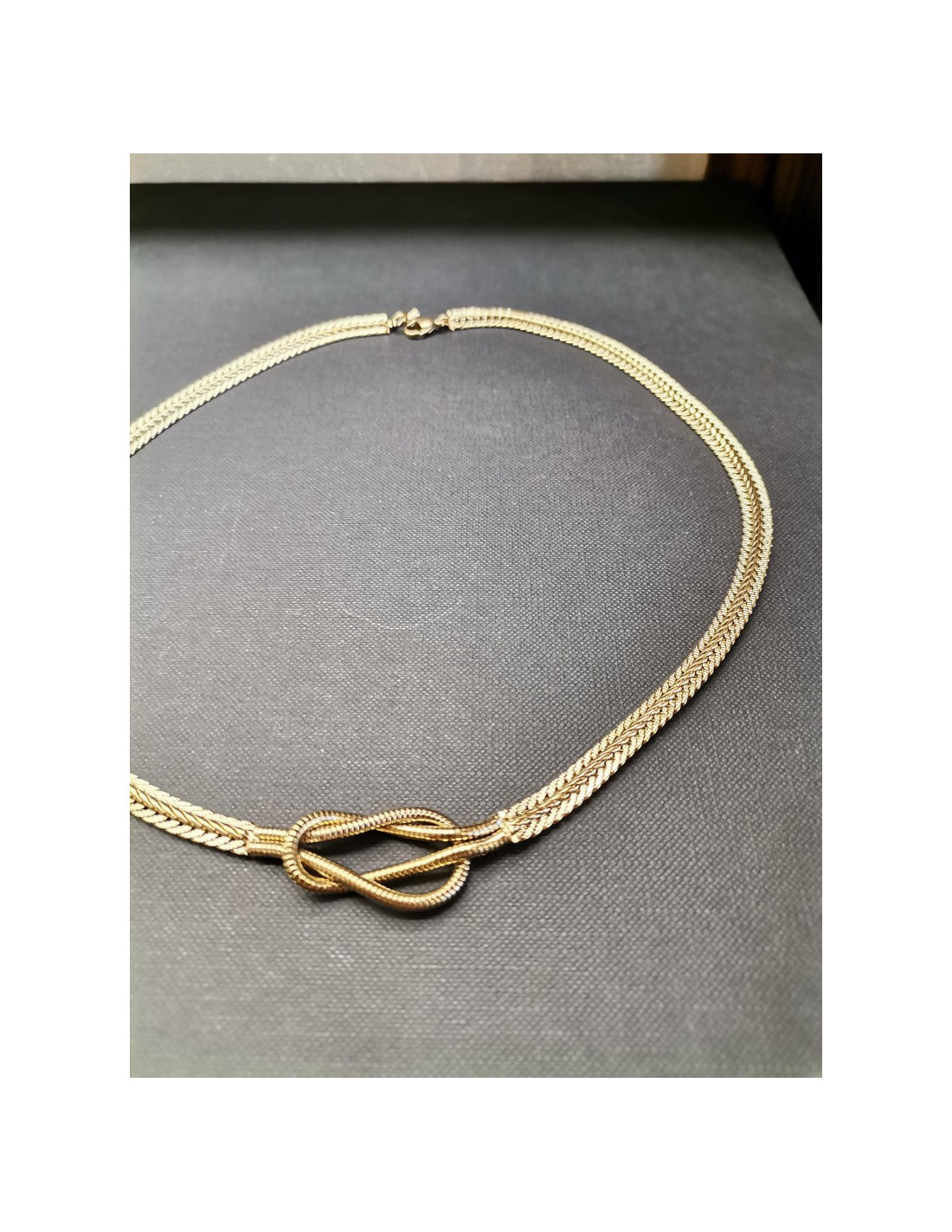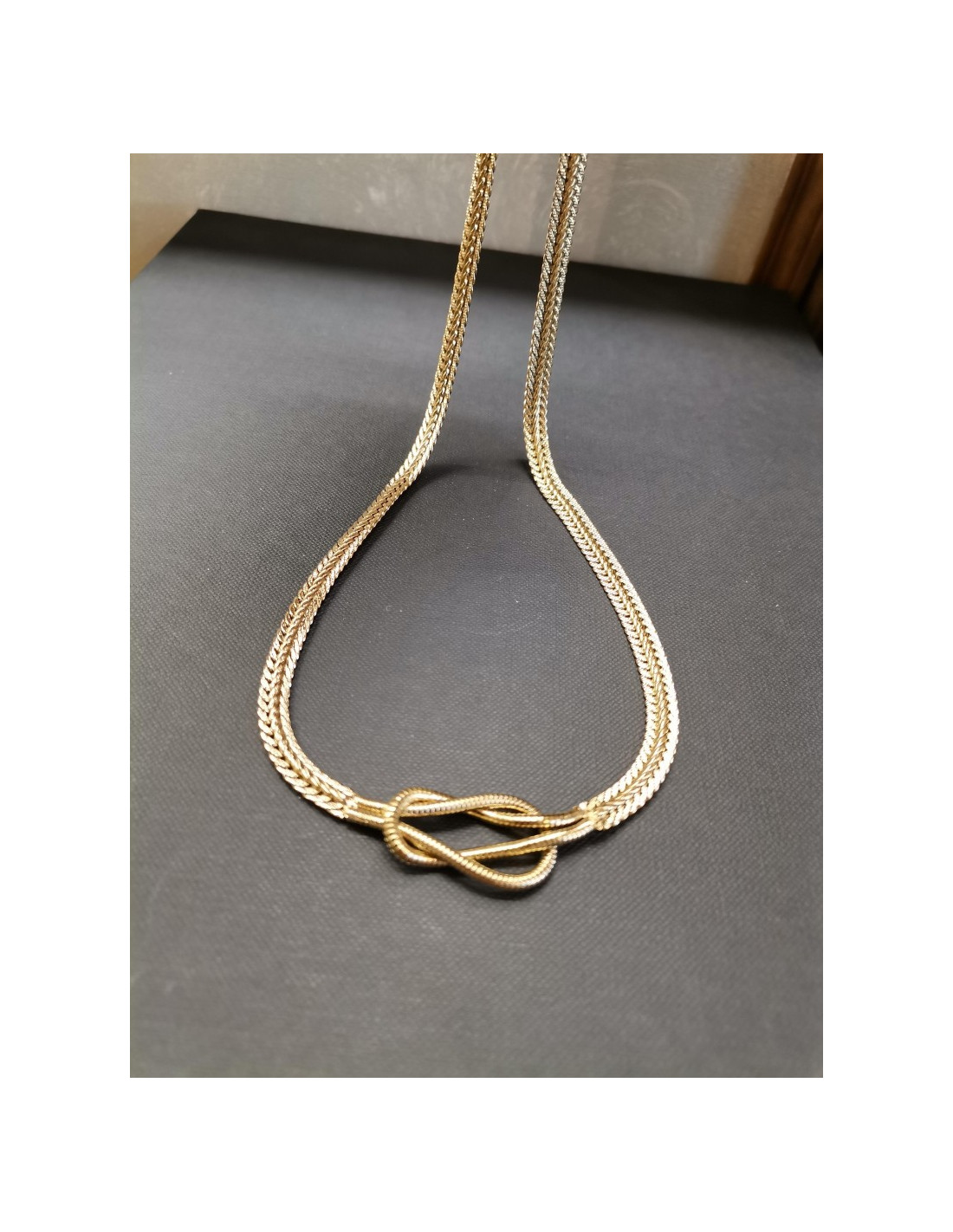 Flat necklace made of braided, flat chain with a decorative knot in the middle. The elegant and distinctive necklace is in gold with a snap clasp fastening,