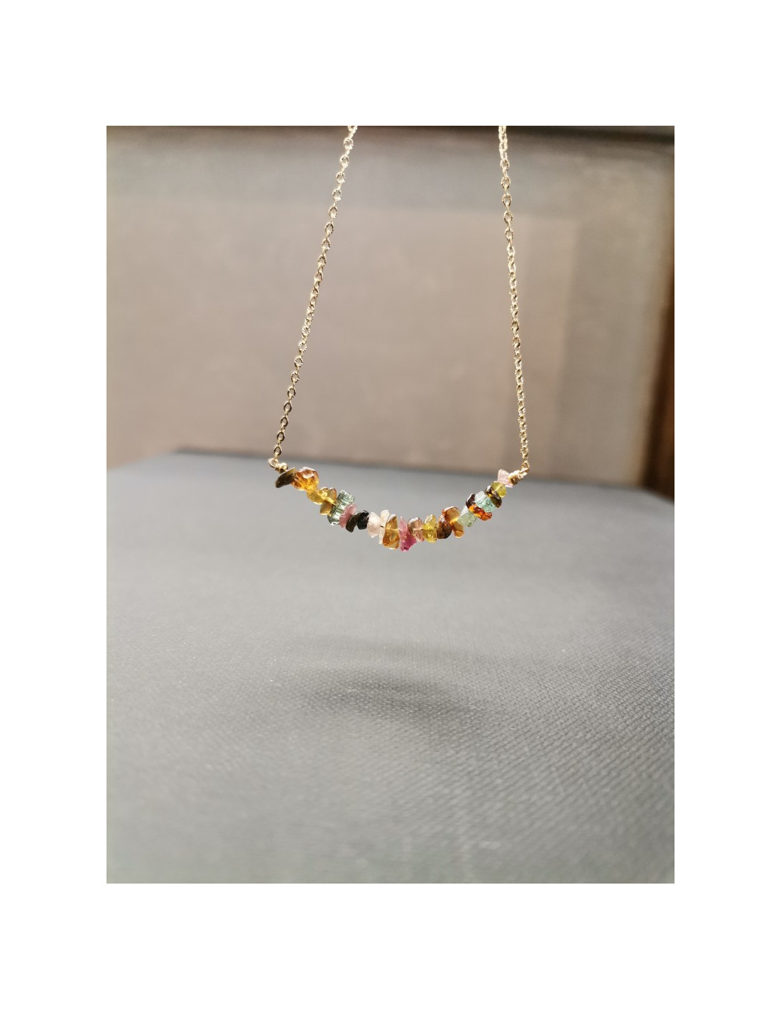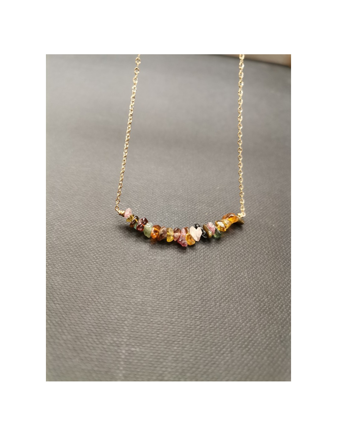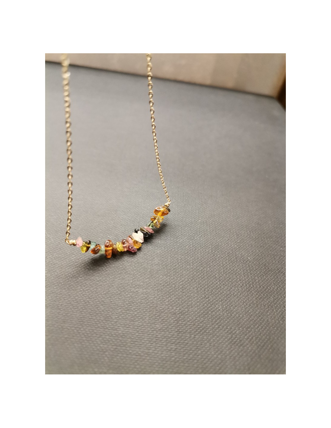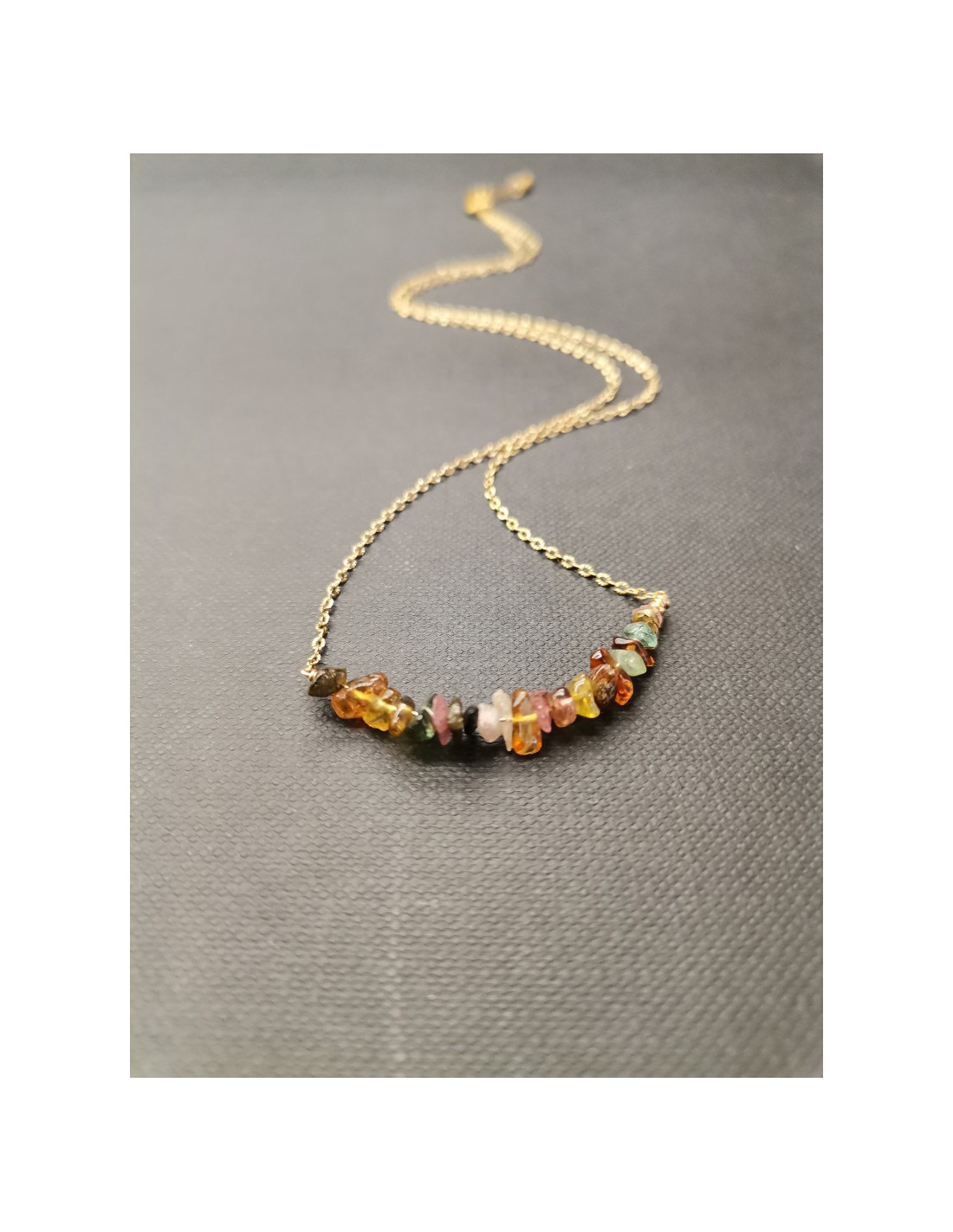 Fine golden stainless steel chain with natural tourmaline stones and carabiner clasp.