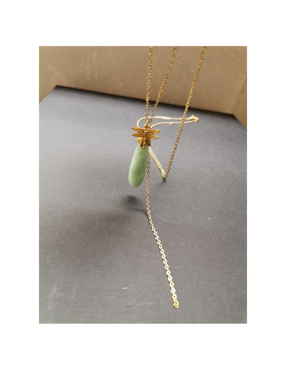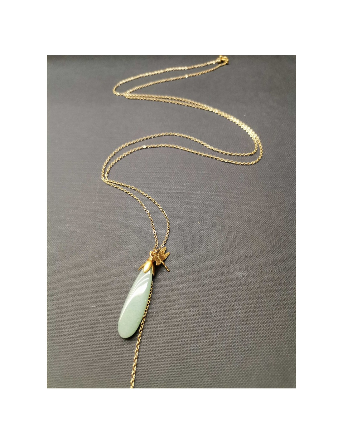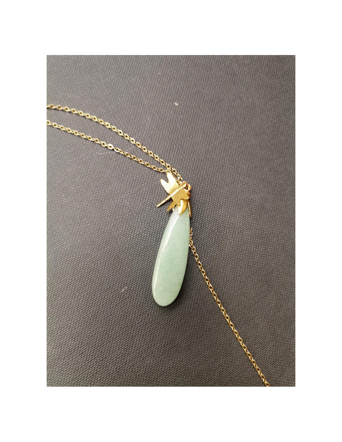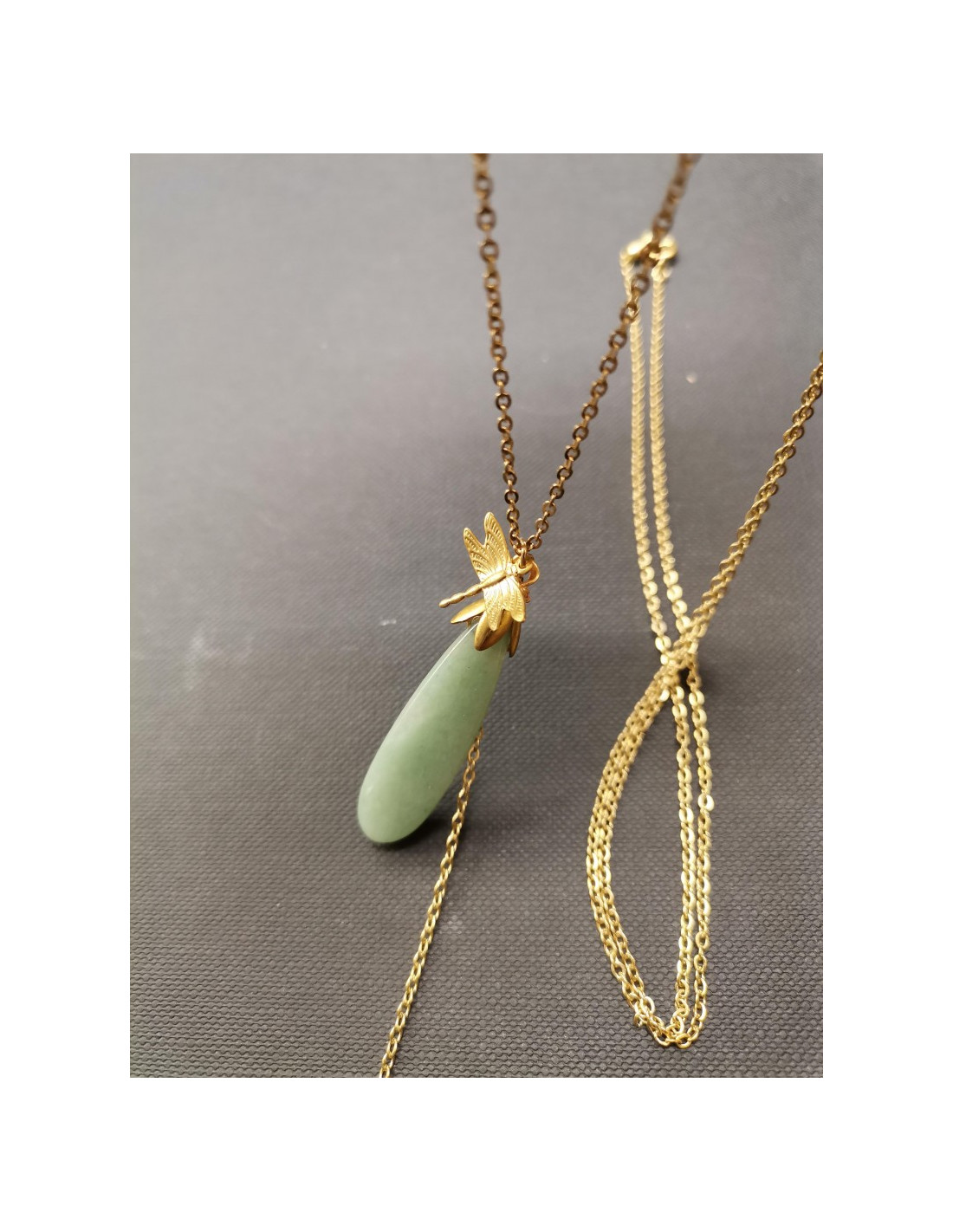 Gold chain necklace with a drop-shaped pendant and a pretty dragonfly detail. The drop is made of natural stone - aventurine.