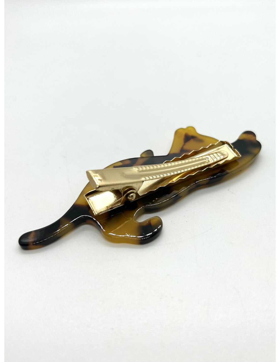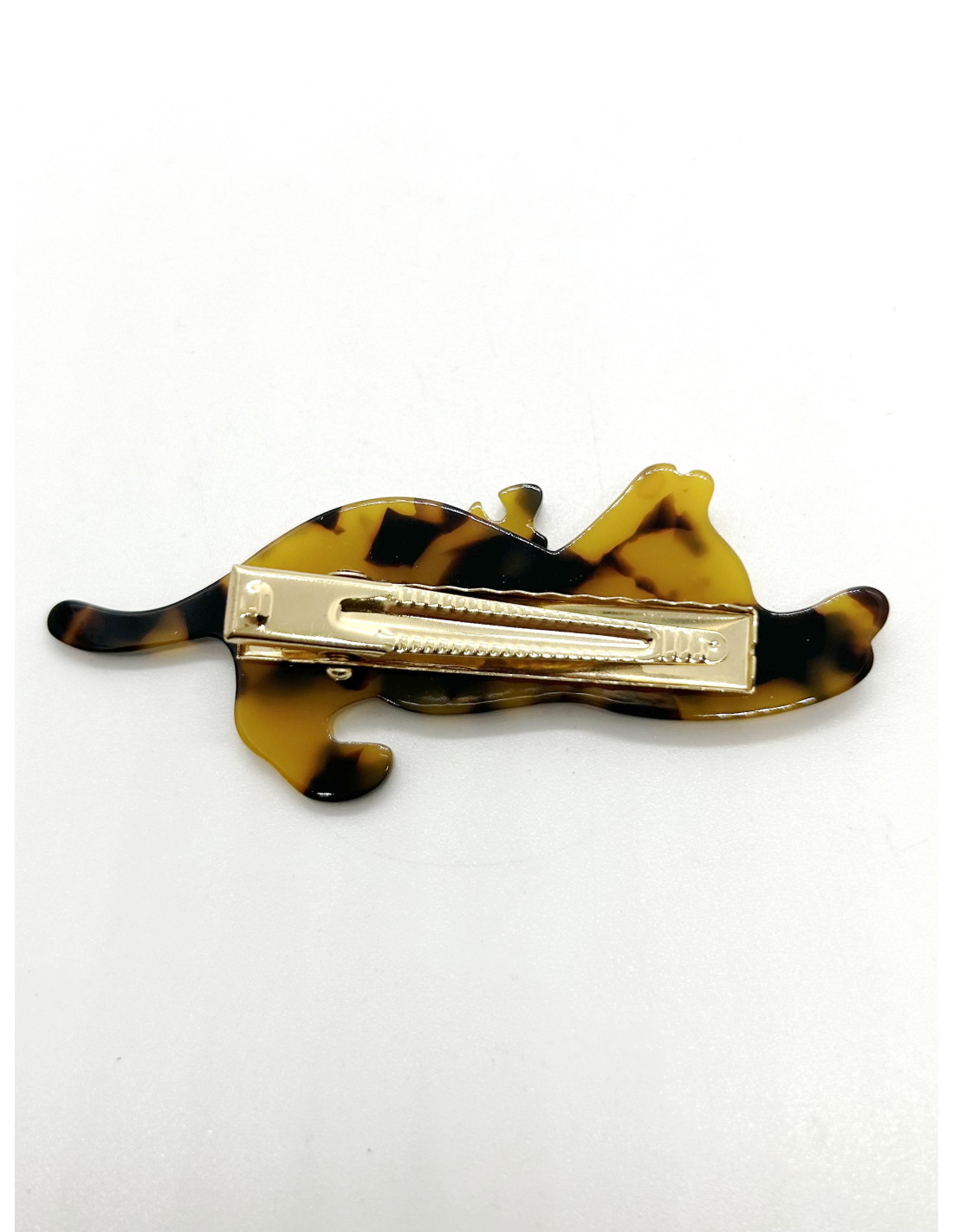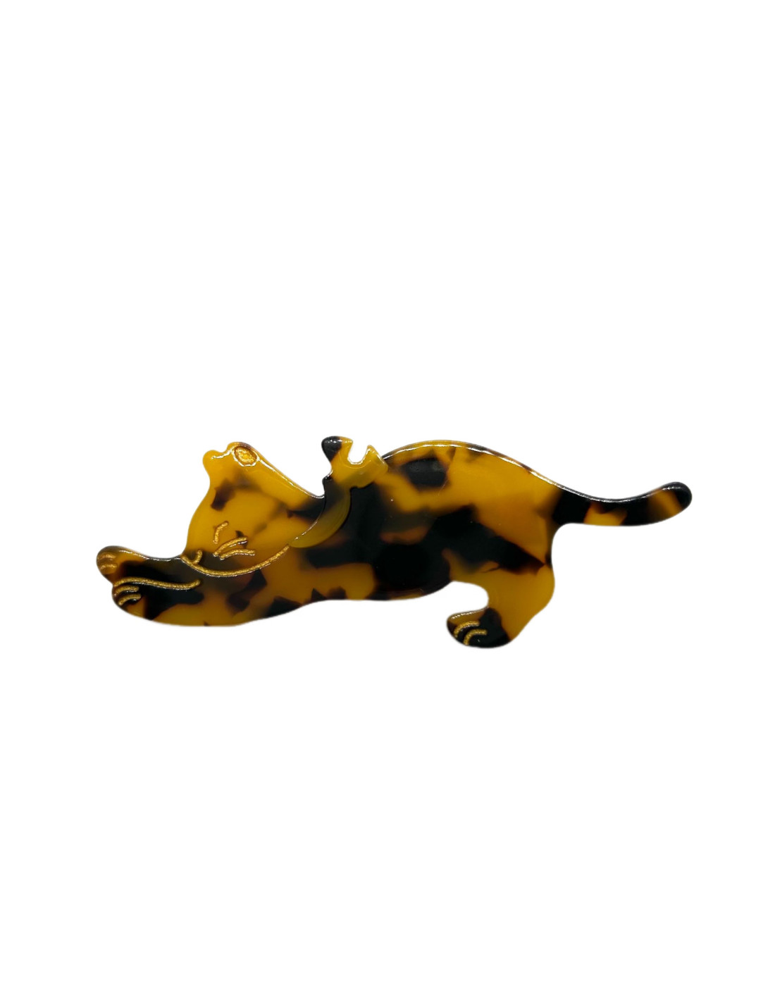 Add a touch of playfulness and elegance to your outfit with the original brooch in the shape of a stretching cat. The jewel catches the eye at first glance with its timeless tiger pattern in warm honey and dark brown tones, reminiscent of luxurious tortoiseshell.