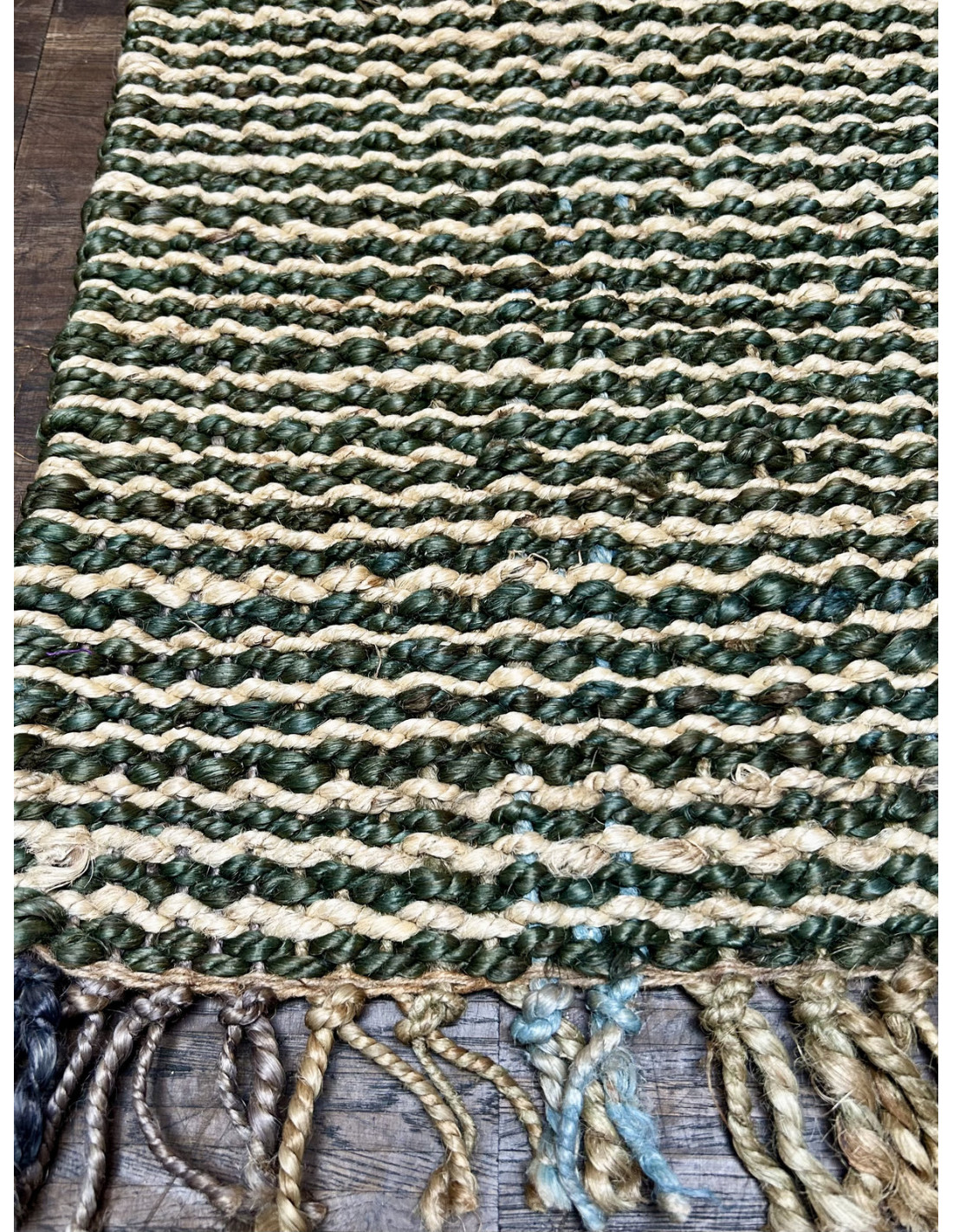 The colourful rug with dark green and beige waves is made of 100% natural material - hemp fibres. The hand-woven carpet is smooth, with a more distinctive weaving texture. The shorter sides of the rug are decorated with fringes. We recommend using a non-slip backing under the rug.