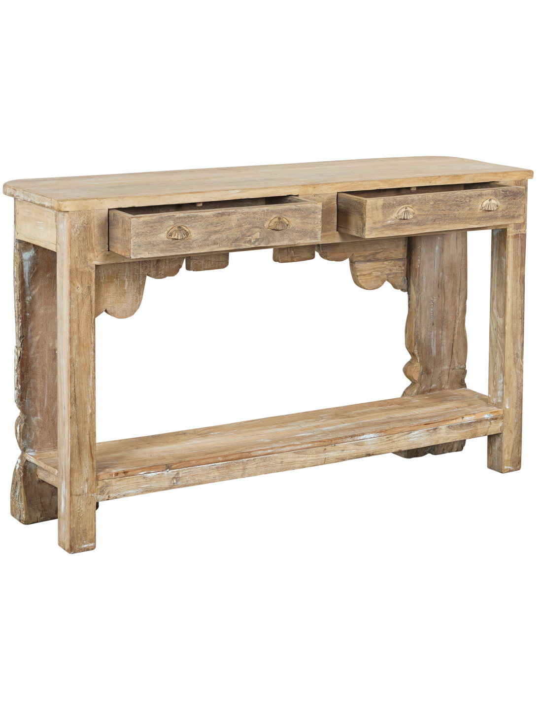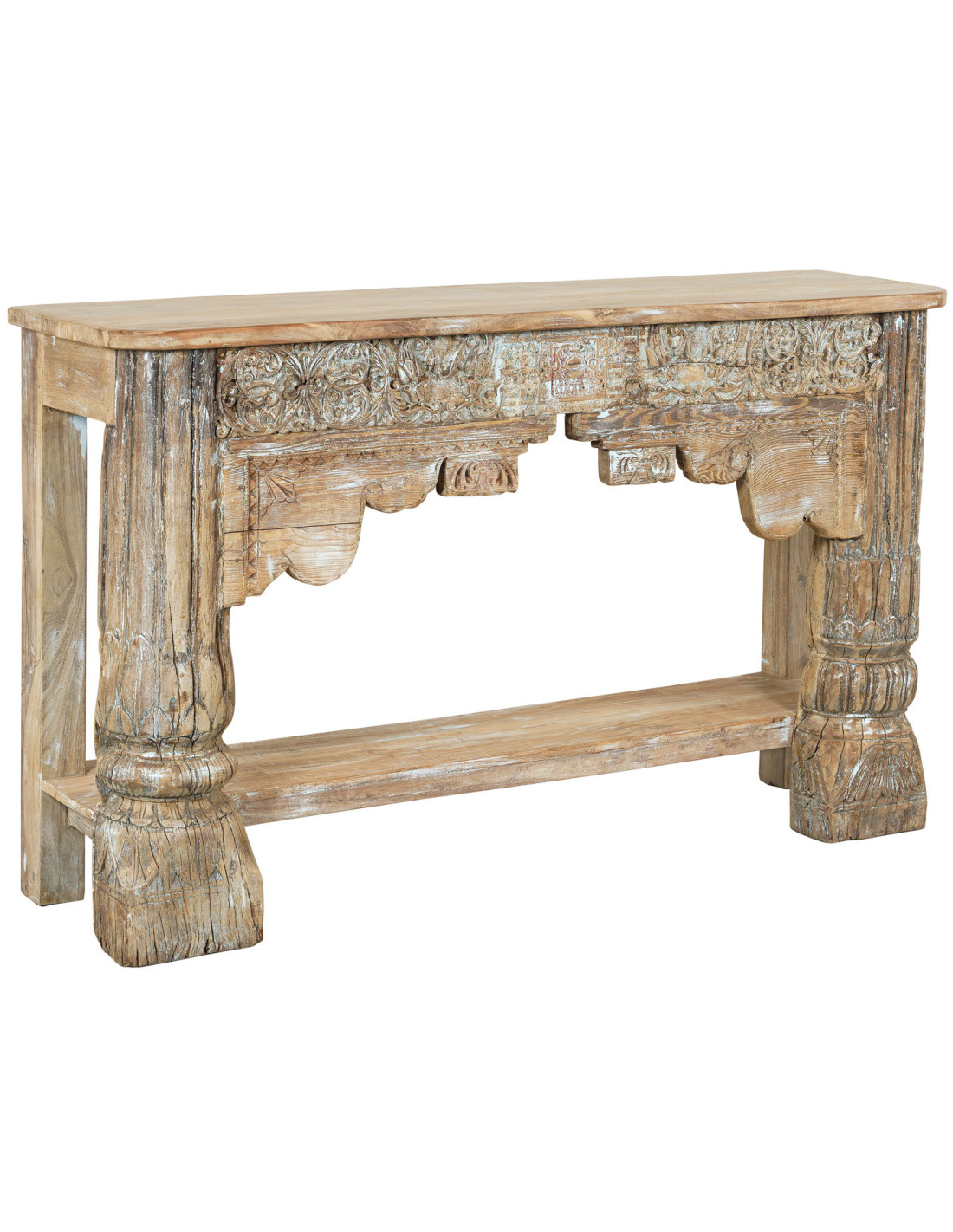 A taller bar table made of solid teak wood that impresses with its unique design. The front is decorated with authentic antique columns with hand carvings, with a distinctive character and history. The natural, lightly patinated finish enhances the wood grain and gives the table a rustic charm. Practical drawers on the back provide storage space for small items. This table is ideal for stylish bars, kitchens or living areas, where it will become an unmissable landmark