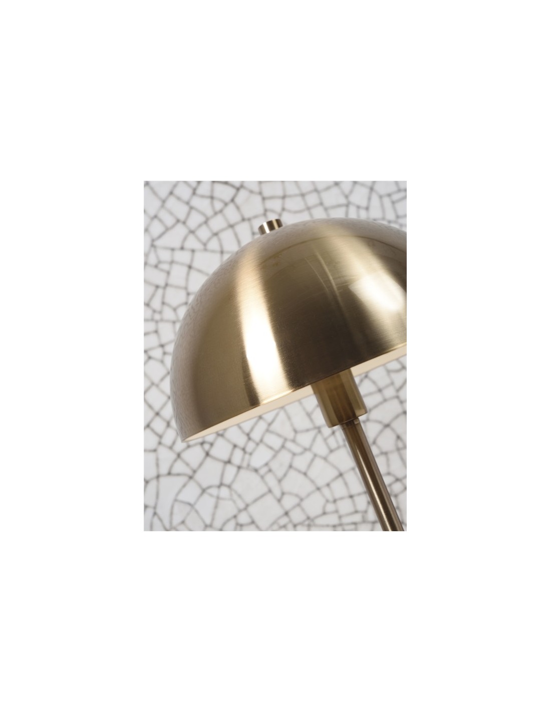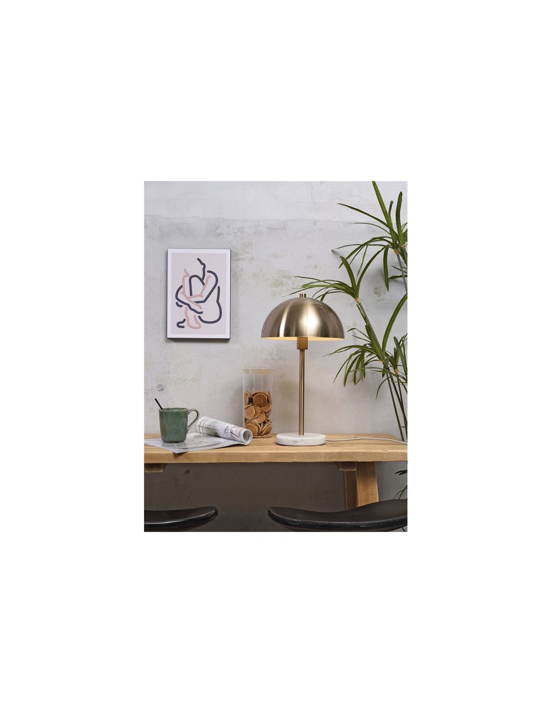 The elegant lamp in shiny gold color is complemented by a marble base. The semi-circular lampshade is white on the inside, which reflects and diffuses the light beautifully. The lamp is a beautiful addition to any interior, whether lit to make the evening atmosphere pleasant or on its own as a decoration.