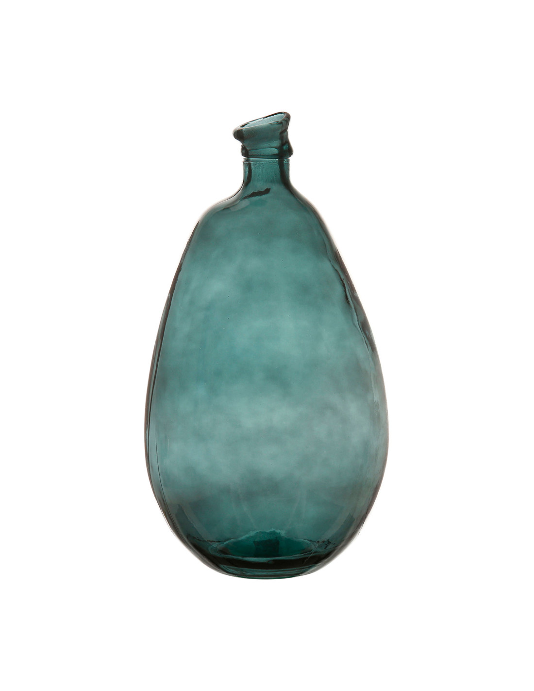 A colourful, shaped vase made of thick, recycled glass that is tinted in an emerald green shade.