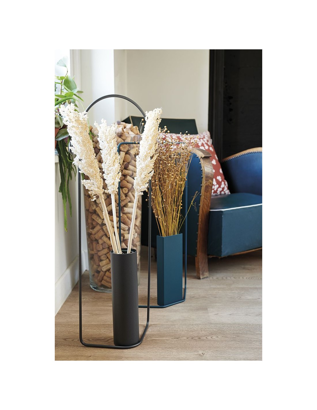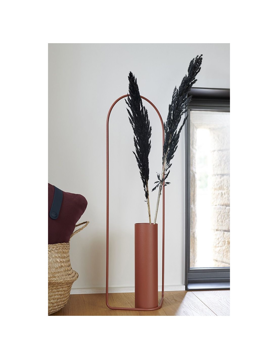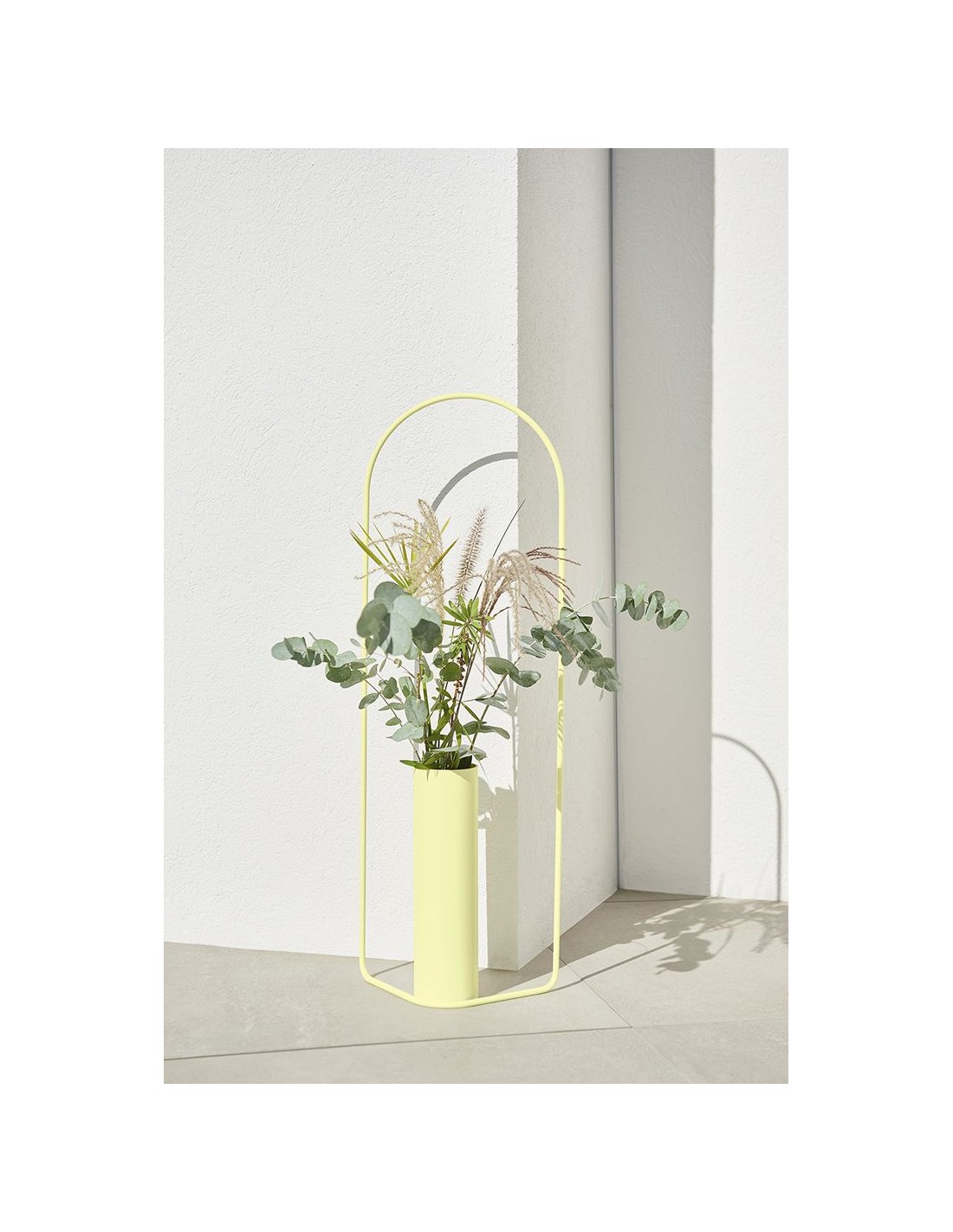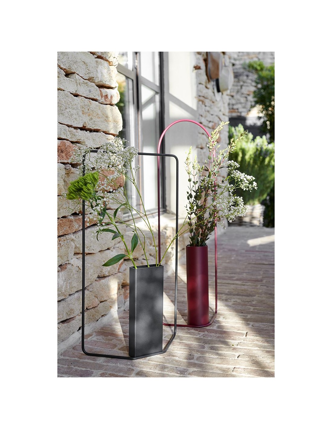 Masterful metal Itac vase with distinctive design and unique visual lightness. More than a simple vase, it is a decorative object that brings nature into the home with elegance. It is lightweight, easy to place on the floor, on furniture or even hang on the wall, try it out to find the right place for it. Thin metal construction with a cylindrical steel tube that houses a black, waterproof and removable tank that fits both fresh and dried flowers. The vase is suitable for indoor and outdoor use.